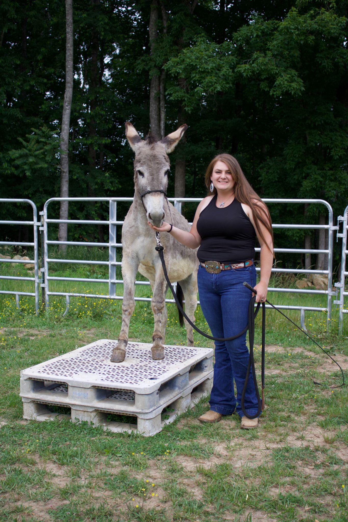 Arabians for her neighbor, learning farrier skills, and started riding in both endurance races and competitive trail on her gaited gelding. Eventually Mikayla had gotten into riding all different breeds and disciplines though she now still specializes in starting colts and producing quality trail mules and horses. In 2022 Mikayla decided to challenge her abilities by opening up to train for the public and with competing in her first Mustang TIP challenge. That first TIP challenge she won grand champion, which really helped grow her training business and fuel the passion to gentle mustangs. Currently she is training both a mustang and a burro in the Bluegrass TIP challenge.