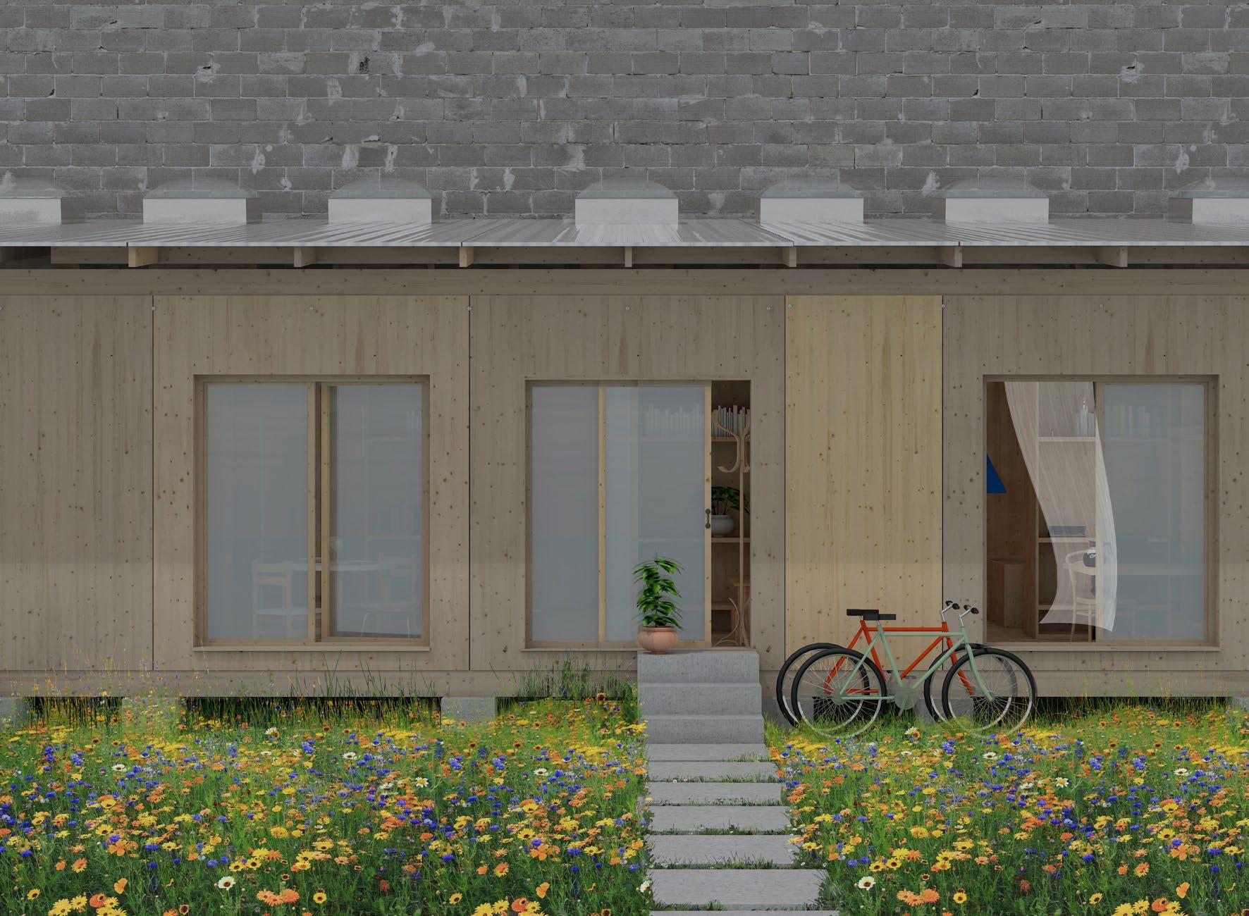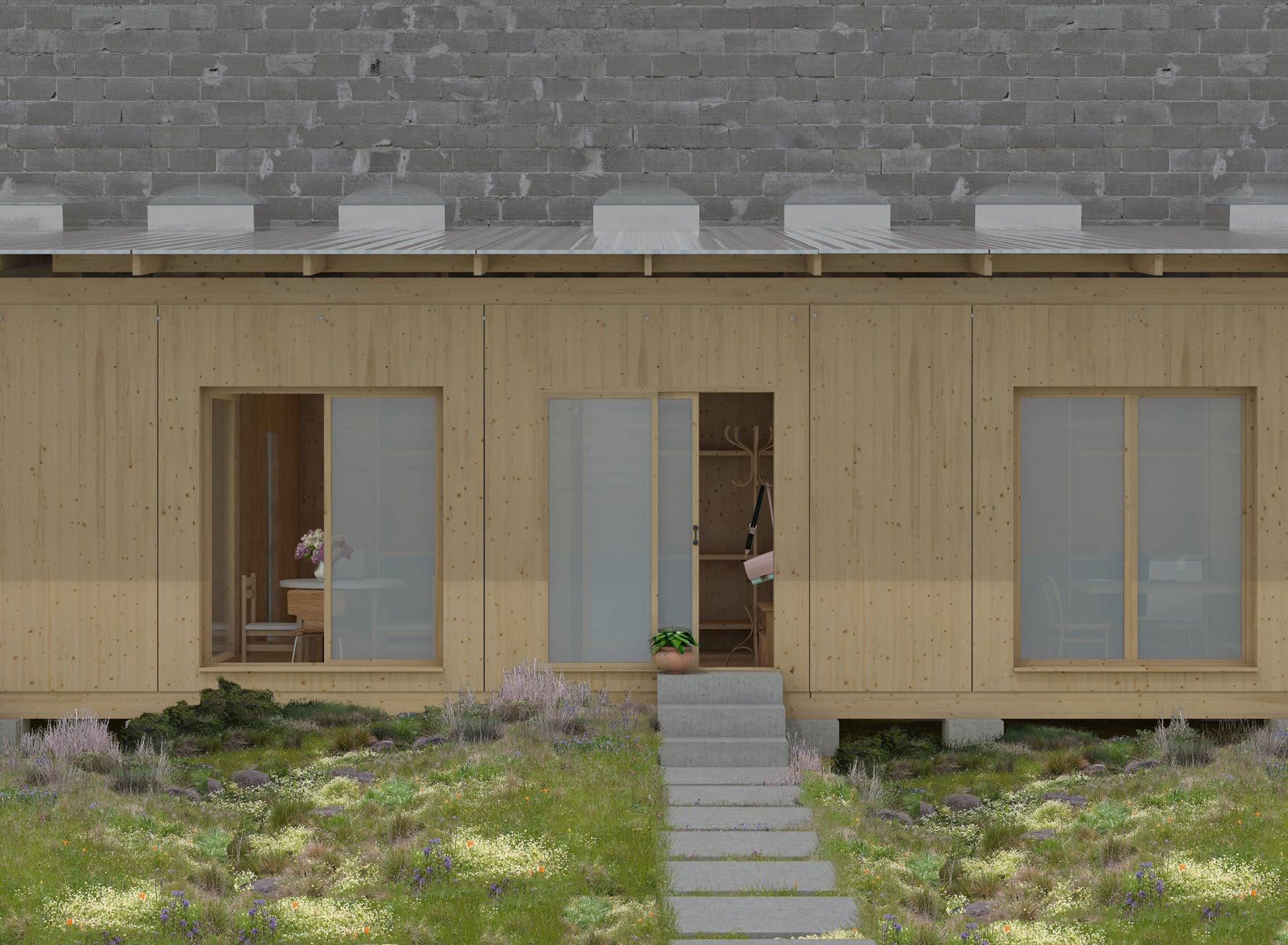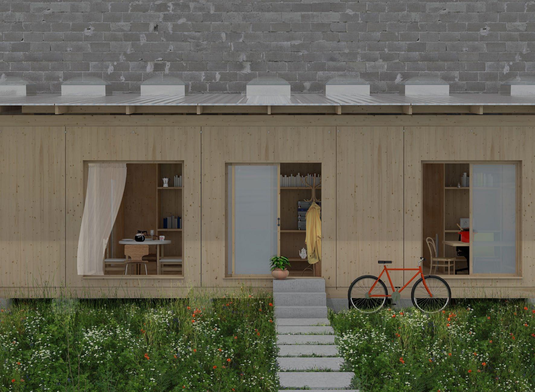 curtains and shelves. There are di fferent floor-plan variations for single people or couples, students and bigger families occupying two units. The communal space is situated on the street side with the big kitchen. Important element is the temporary fence that serves as a communication surface about Communa‘s events and about the future of CLT homes.