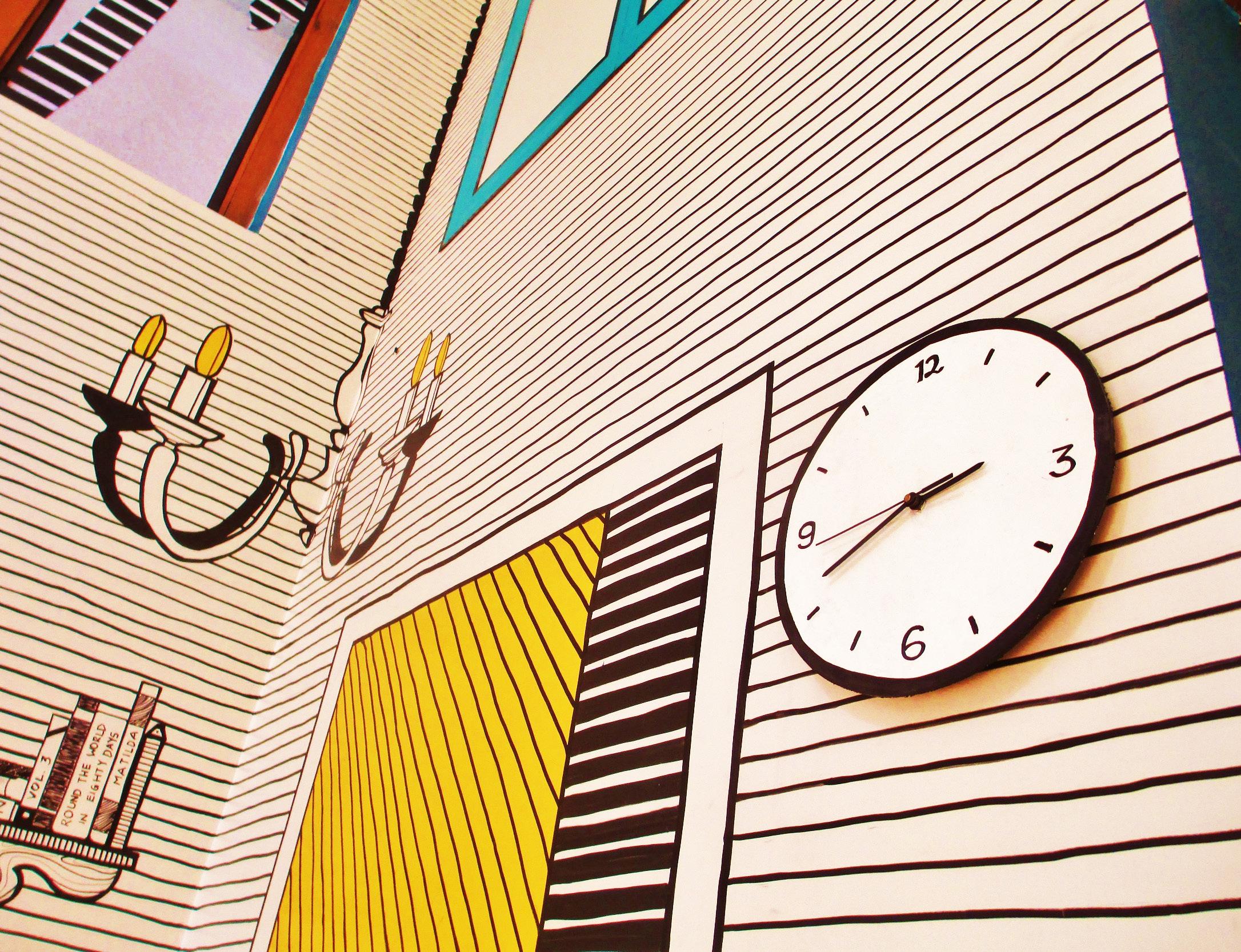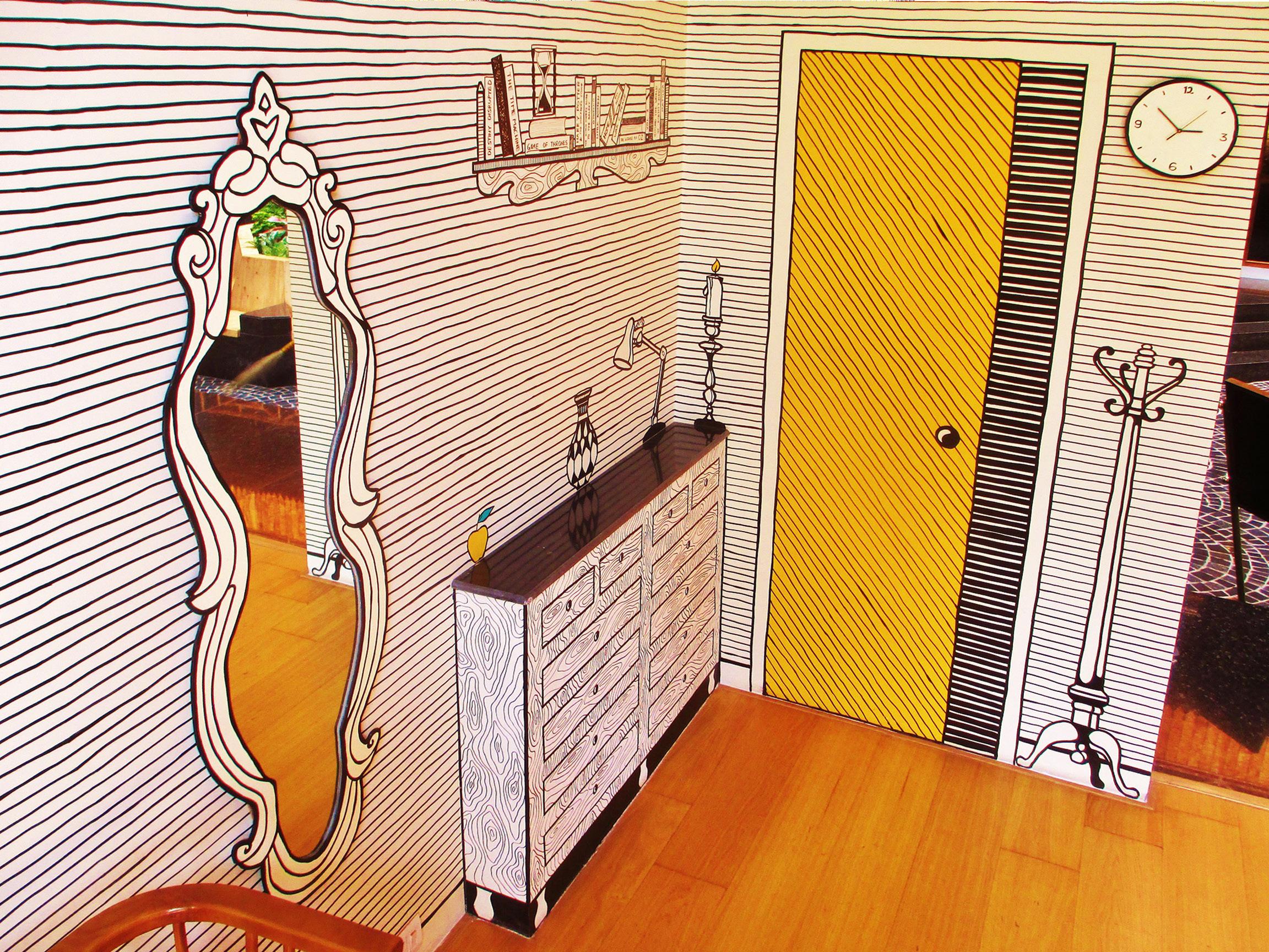 Drawn orthographic projections (or “elevations”) of familiar objects are curated and scaled within an imaginary room to create the illusion of a cozy, nostalgic space on the blank canvas of a double-height hotel lounge. Graphical compositions of books, shelves, hanging chandeliers, photo frames and other household objects with varying line thicknesses sow familiarity and spatial depth in an otherwise abstract orthographic drawing style. The artwork not only brings life and humor to the space with illustration, but also physically engages with visitors with looking mirrors, a running clock and ledges to place real objects. The blurring of real vs. drawn objects showcases the potential of drawings to mimic reality and vice versa.