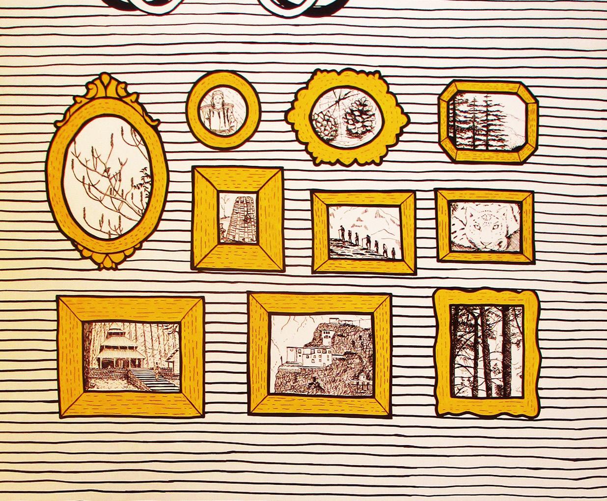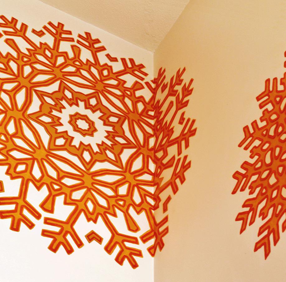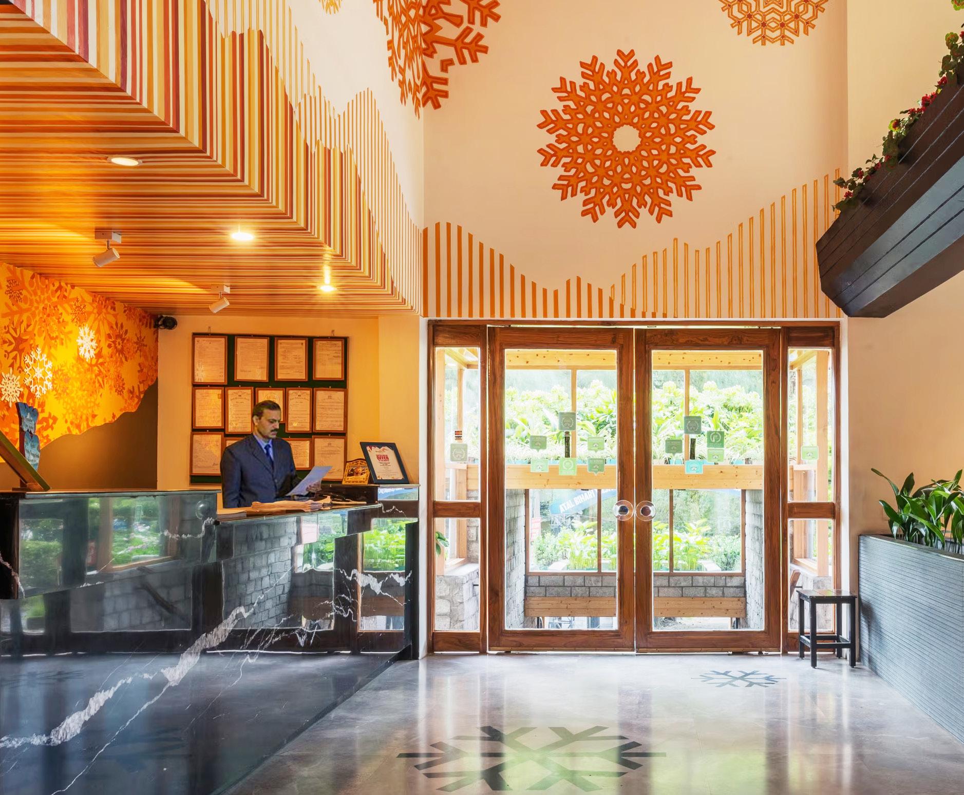 In this 325 sq.ft mural, mountains jog like stretched strings from the back of the reception counter, onto the ceiling and up the walls of the entrance lobby of the Honeymoon Inn Resort’s reception area. The mural explores snowf lake fractal geometries in the warm color pallet characteristic of locally woven Himalayan fabrics.
