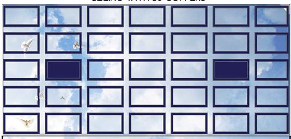 The photorealistic representation style is a modern take on many European precedents. The often historically used illusion of a “room without a roof” has been employed, continuing the sky within the altar’s hillside scene upwards and enveloping the viewer. The 35 coffers in the ceiling and surrounding arched moldings of the historical monument have been accentuated in contrast to frame the sky. An outburst of tree branches and f lying doves from the chapel rear wall contrast natural forms within manmade symmetric geometries. While being an obvious reference to the “heavens above”, the imagery never transcends the realm of realism onto fantasy or religious iconography, inviting in secular audiences.