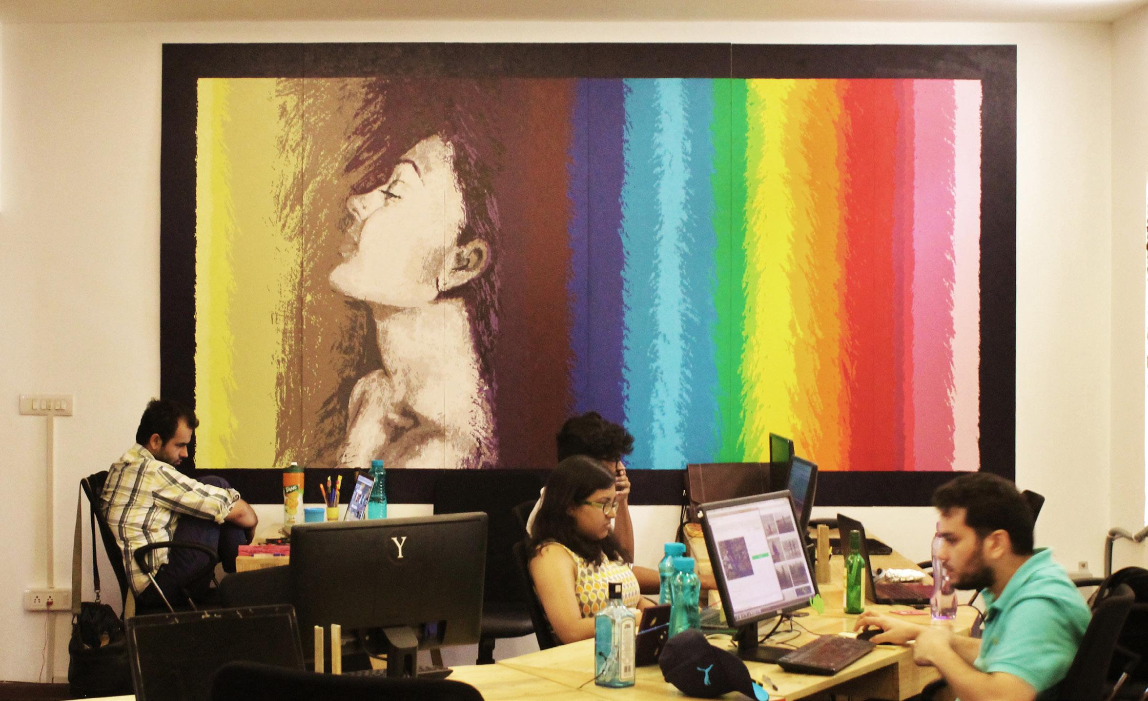 This 96 sq.ft larger-than-life f igurative painting captures the f leeting feeling of complete bodily autonomy while deconstructing the iconic LGBTQ f lag colors in layered “goopy” textures. Commissioned within Youth Ki Awaaz‘s off ice space to echo the company’s pioneering role in journalism on the issues of gender, sexuality, and LGBTQ rights - often taboo topics in Indian society, especially in the workplace – the installation explicitly creates an inclusive safe space and also serves as a symbol for the freedoms worth f ighting for.