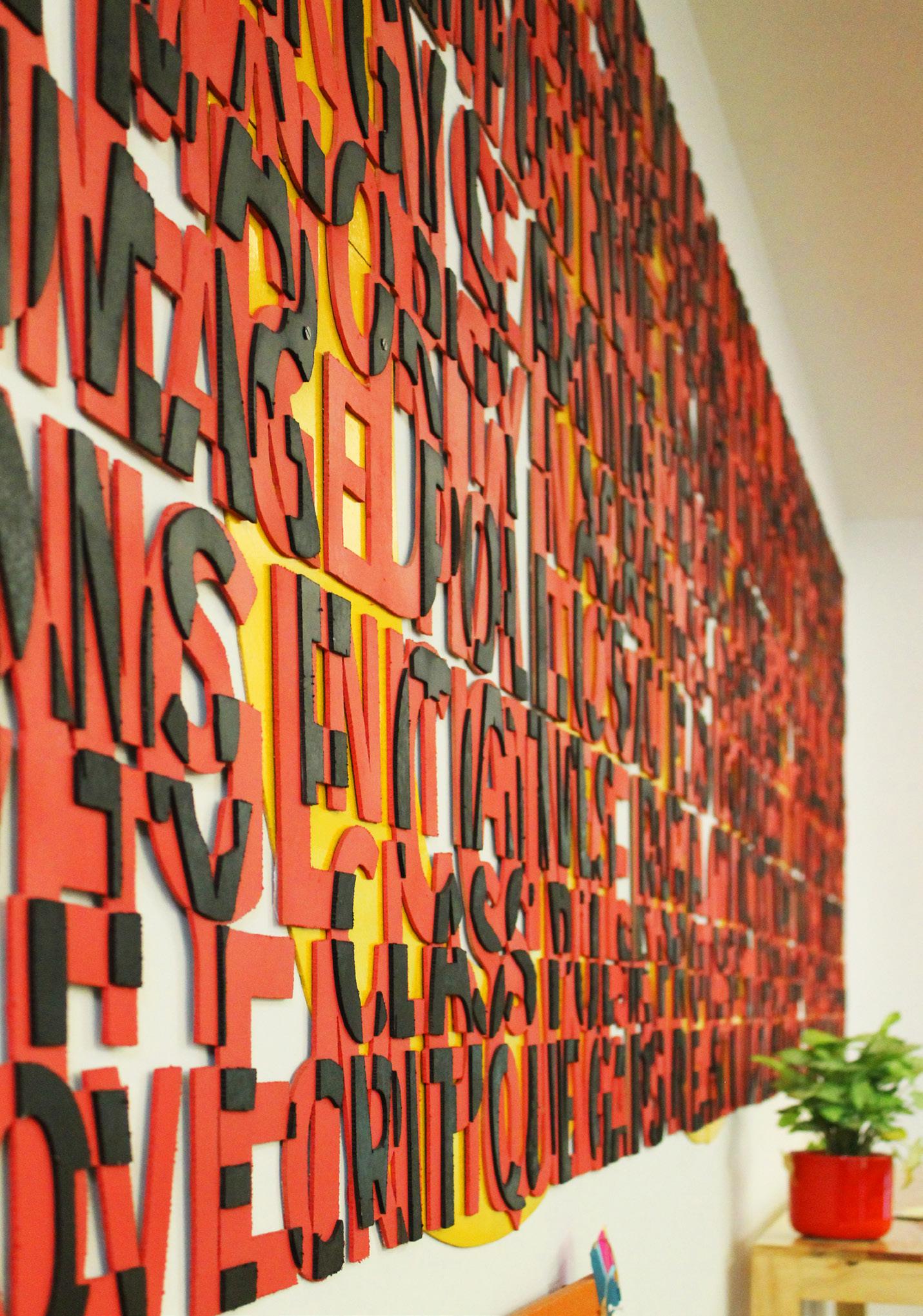 The resulting artwork is a playful exercise in discerning what words each overlapped piece contributes to. This installation was concieved in conjunction with the furniture and interior design of the rest of the office space that also uses bold colors and angular wood work and typographical elements.