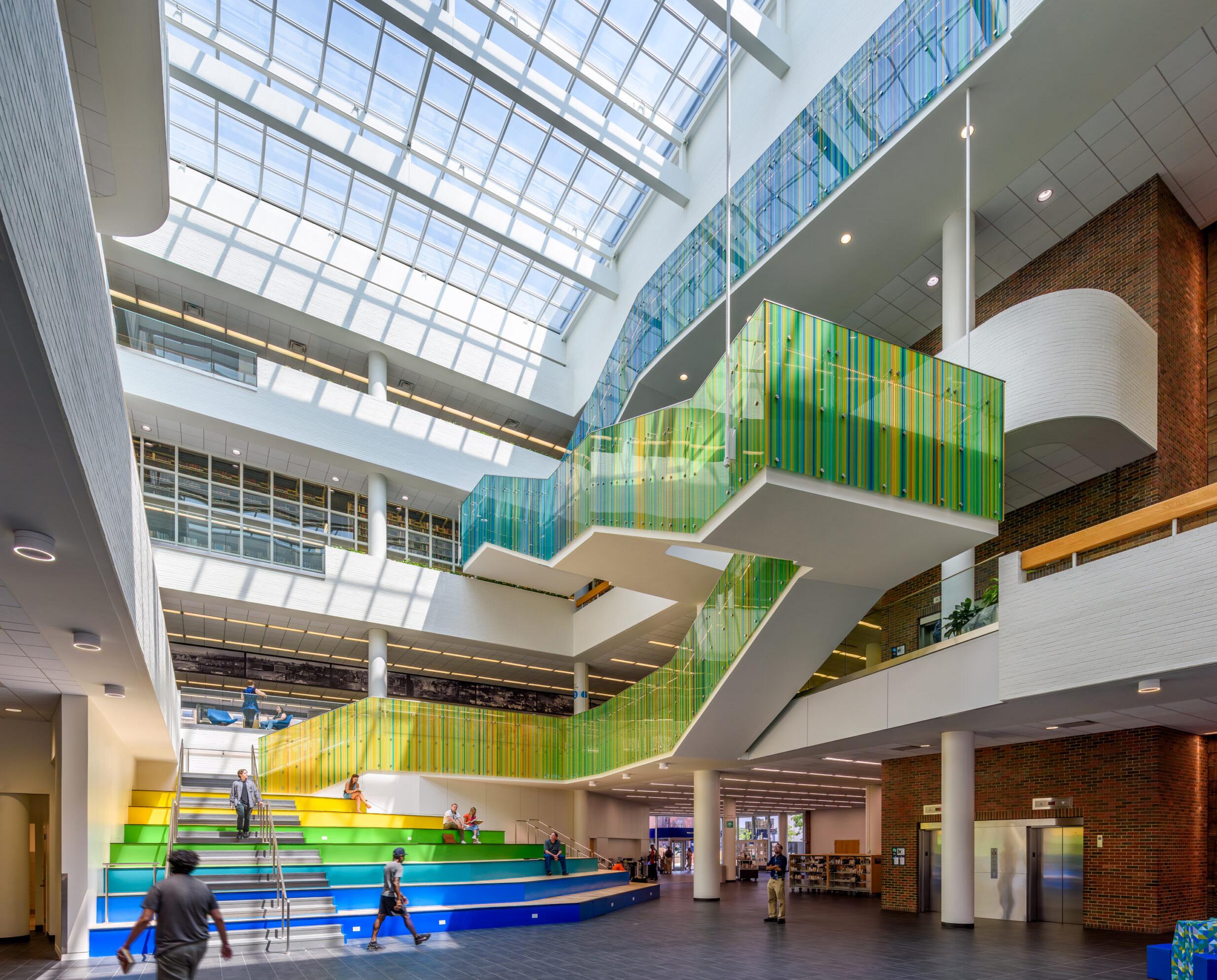 This 2700 sq.ft art installation captures Cincinnati’s rich musical history through custom-made printed laminated glass panels that document the albums recorded at local recording studios since 1945. With the help of local music historians and experts, a list of 1602 albums was meticulously curated and vetted containing artist names and recording dates. Different genres of music are color coded to reflect the city’s musical evolution over time resulting in a rich f iligreed gradient across the entire art piece. Located at the core of the building, library users traverse this four-dimensional graphical journey through space and time as they ascend the staircase in the atrium, reading along the railings the distinct names of iconic albums and artists. Familiar albums trigger nostalgia while forgotten gems from the past are unearthed. 115