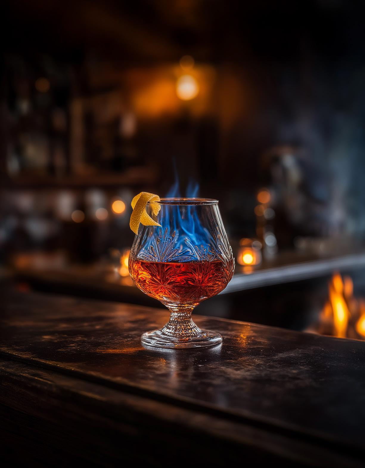 The Blue Blazer is a classic cocktail that dates back to the early 1800s. It was created by Jerry Thomas, one of the first American bartenders, and is said to be one of Thomas' signature drinks. The Blue Blazer is a mix of Scotch whisky and boiling water, which is then set on fire and passed back and forth between two glasses. A classic cocktail made with Scotch whisky and boiling water, set on fire and passed back and forth between two glasses.