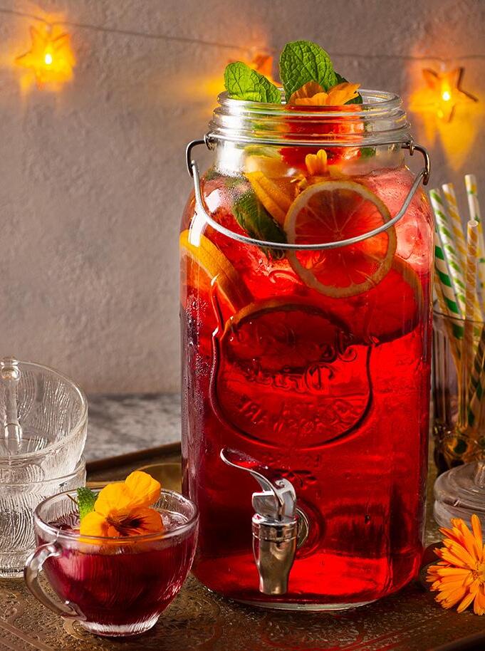 Combine all ingredients in a punch bowl or vintage drink dispenser with ice, stir gently.