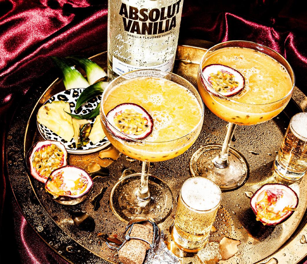 Using a paring knife, cut a medium-thick pineapple slice. Grab a cocktail shaker and add the pineapple slice. Use a muddler to mash up the pineapple. Pour Absolut Vanilia, passion fruit pulp, vanilla syrup, and passion fruit purée into the shaker. Add ice cubes to the shaker. Give everything a vigorous shake. Grab a hawthorne strainer together with a fine strainer and double strain the mix into a chilled cocktail glass. Using a paring knife, cut one passion fruit in half. Top off your cocktail with a floating half of passion fruit. Serve alongside a shot of ice-cold champagne (or prosecco) and enjoy!