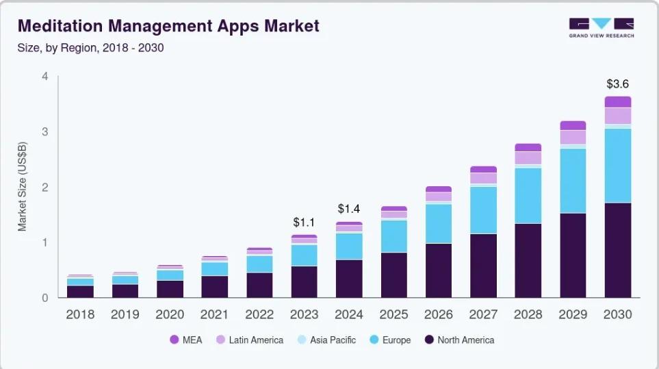 Meditation apps make it easy for anyone to relax and clear their mind. You don’t need to be an expert as these apps guide you step-by-step, with calm meditation music, relaxation sleep sounds, and even bedtime stories to help you sleep. Because they’re so helpful and simple to use, more and more people are downloading them. In 2023, the global market for meditation management apps was worth $1,131.9 million and it is expected to reach $3,632.3 million by 2030.
