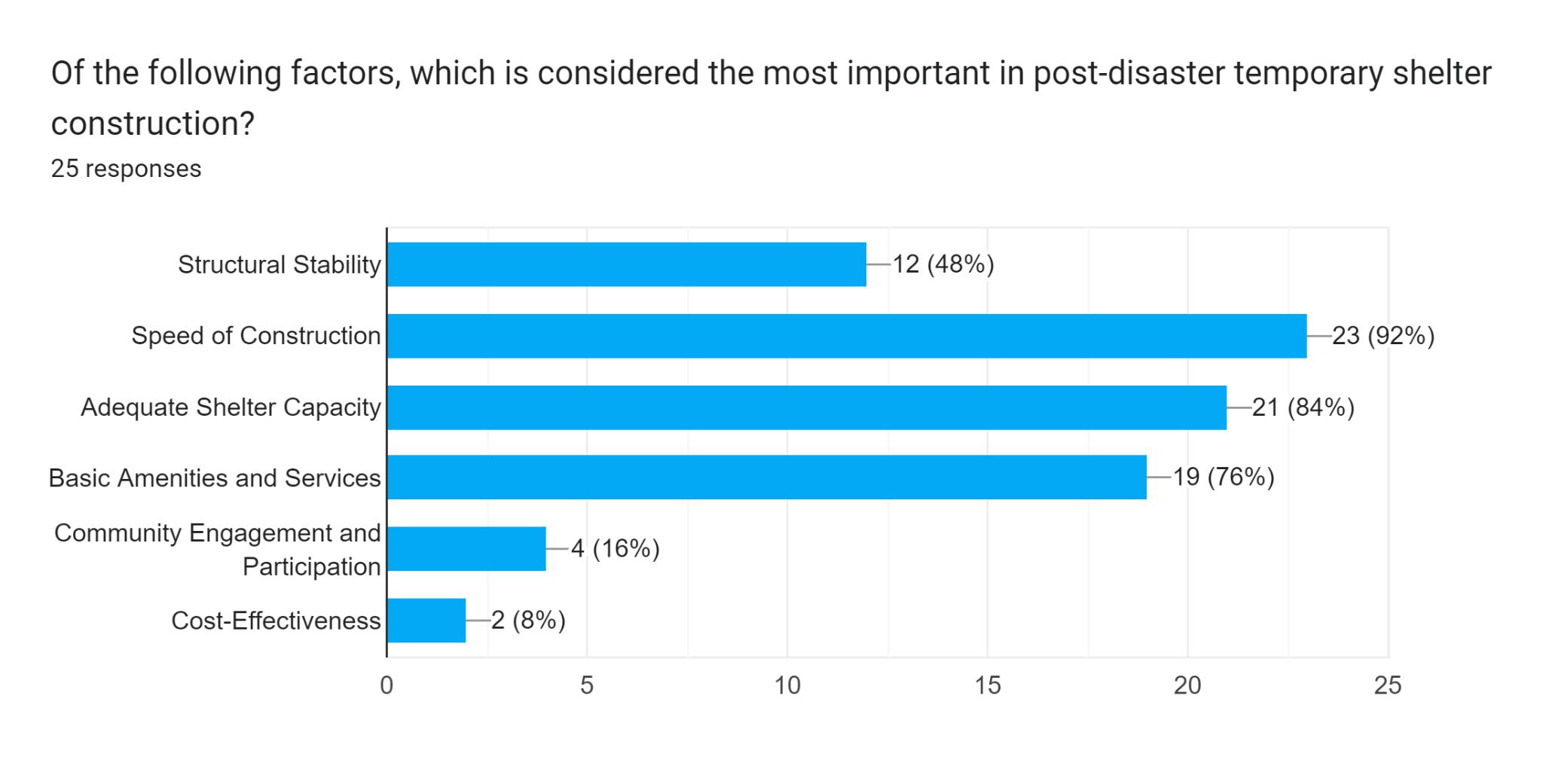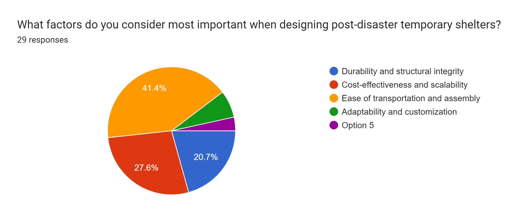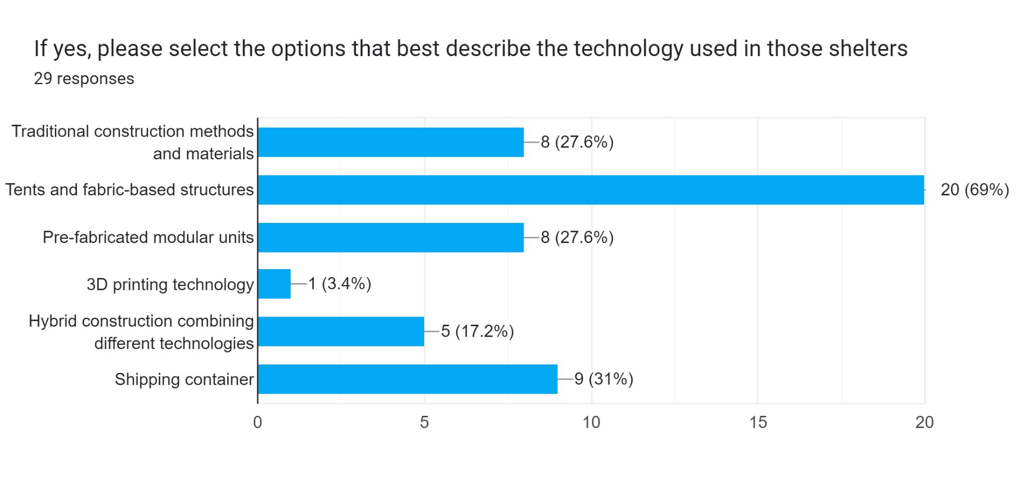 ● lightweight composite materials are seen as a favorable technology due totheirstrength, durability, and potential for rapid construction. Modular construction is also highly regarded for its flexibility, scalability, and ease of assembly Shipping containers, although selected by a smaller number of participants, can still be a viable optiondueto their availability and potential for repurposing. 3D printing, while receiving fewer responses, is a technology with promising potential foron-siteconstructionoftemporary sheltersusingvariousmaterials.