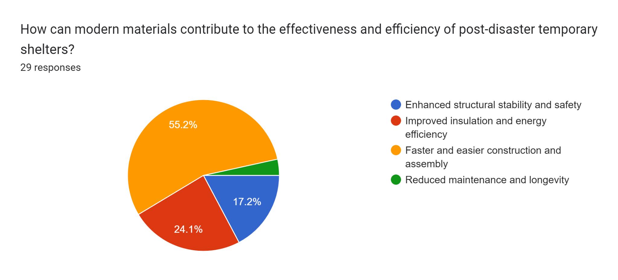 ● the responses highlight the multiple benefits that modern materials can bring to post-disaster temporary shelters, including faster construction, improved energy efficiency, enhanced safety, and reduced maintenance requirements Incorporating these materials can contribute to more effectiveandefficientsheltersolutionsforaffectedcommunities.
