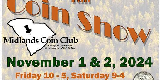 Medallion Center, 7309 Garners Ferry Rd., Columbia, Friday 10am-5pm , Saturday 9am-4pm This family-friendly event will encompass two days' worth of buying, selling, and trading of numismatic material and is the largest show in the Midlands! Free admission and parking, with hourly door prizes. MidlandsCoinClub.com