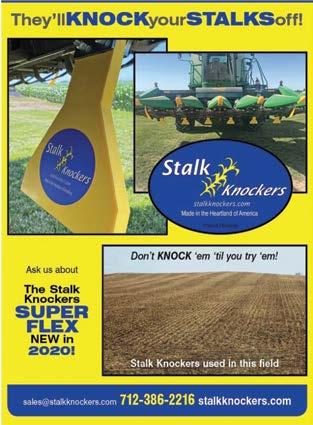 Stalk Knockers are the most user friendly and lightest weight option on the market. No need to be removed when trailering, saving valuable time. They were invented by two farmers in southwest Iowa looking for a better solution for managing stalk residue on their own farm. www.stalkknockers.com .
