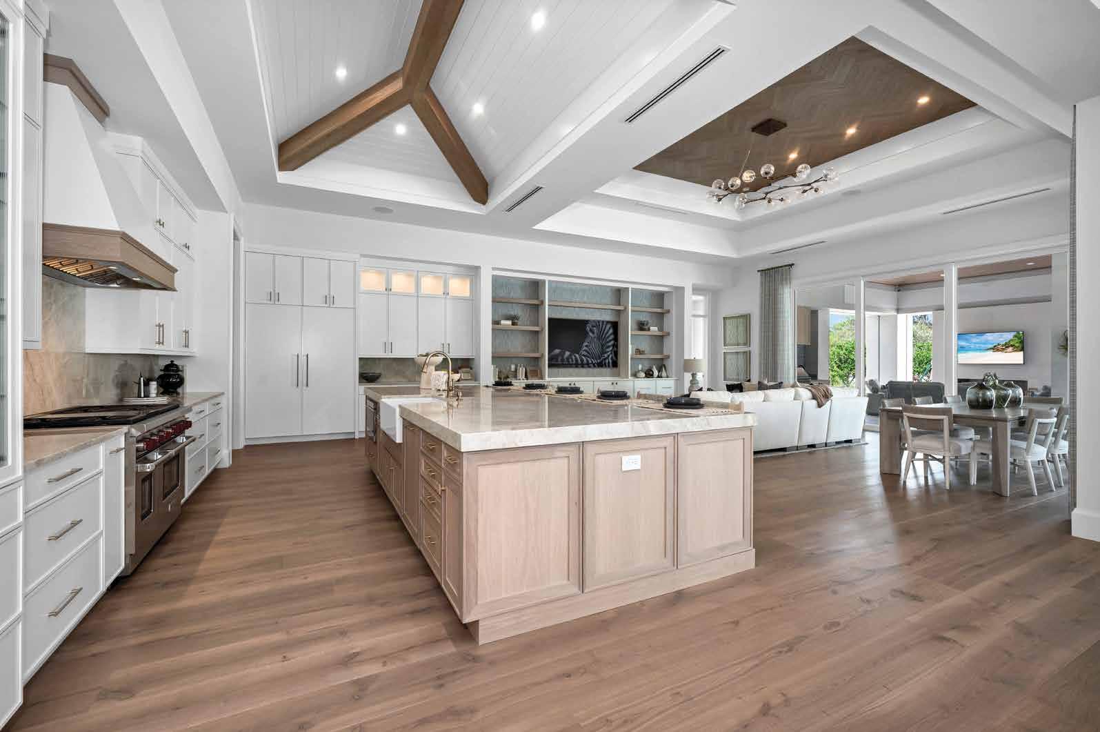 The Moorings Residence exudes warmth and elegance with its 10” wide planks in the captivating Earth color, setting a stunning foundation throughout the home. Rustic wood beams overhead enhance the natural charm, creating a beautifully balanced space that’s both timeless and sophisticated.