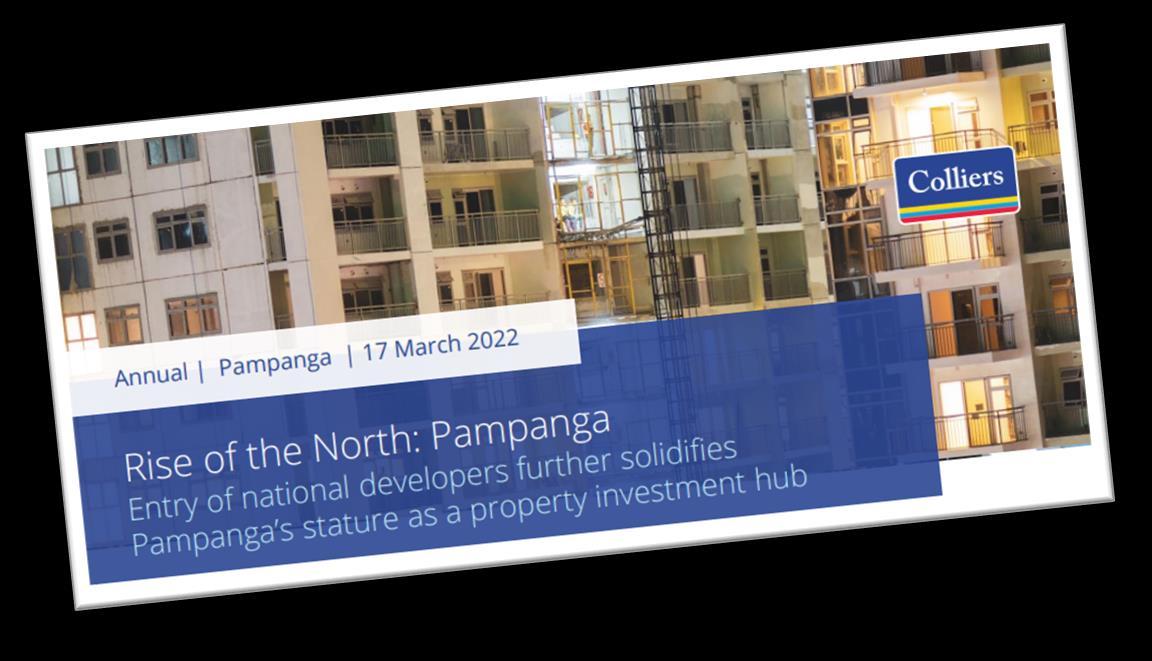 According to Colliers Market Intelligence Research, Q4 2021 Residential Survey, 15% of the respondents chose Pampanga for their next residential investment. and 8% said that they plan to buy vertical condominiums in Pampanga.
