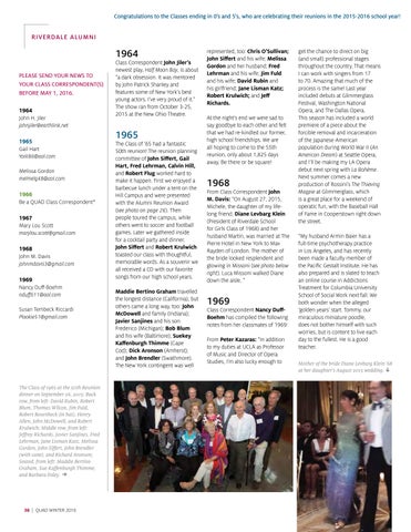 Class Correspondent Nancy DuffBoehm has compiled the following notes from her classmates of 1969: From Peter Kazaras: “In addition to my duties at UCLA as Professor of Music and Director of Opera Studies, I’m also lucky enough to