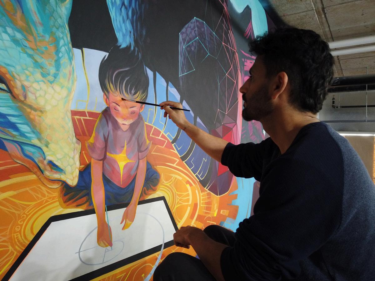 The mural has an Augmented Reality component that brings it to life by aligning the split masks at the center, one over the other This visual effect illustrates how layers of emotions accumulate to create a low-frequency personality and how, by uncovering them, one can return to their true self