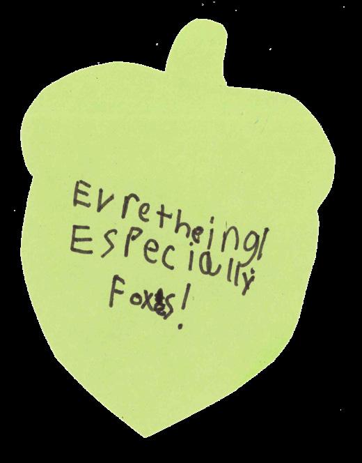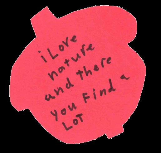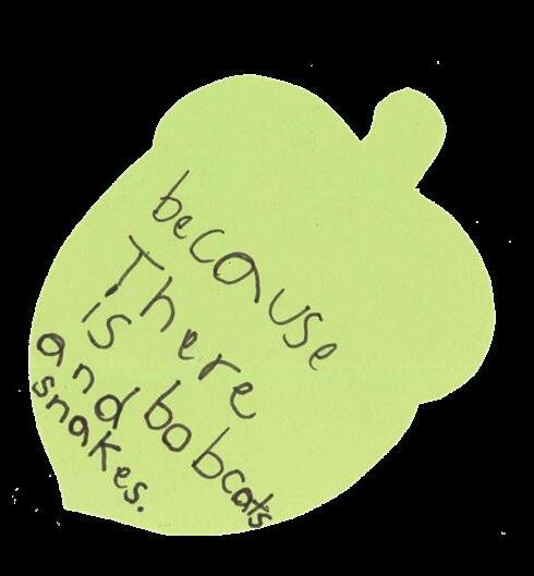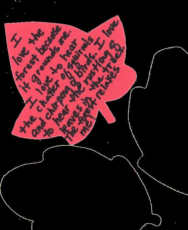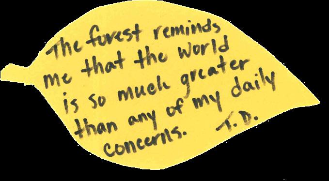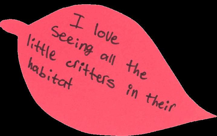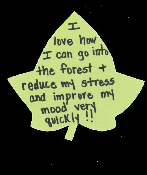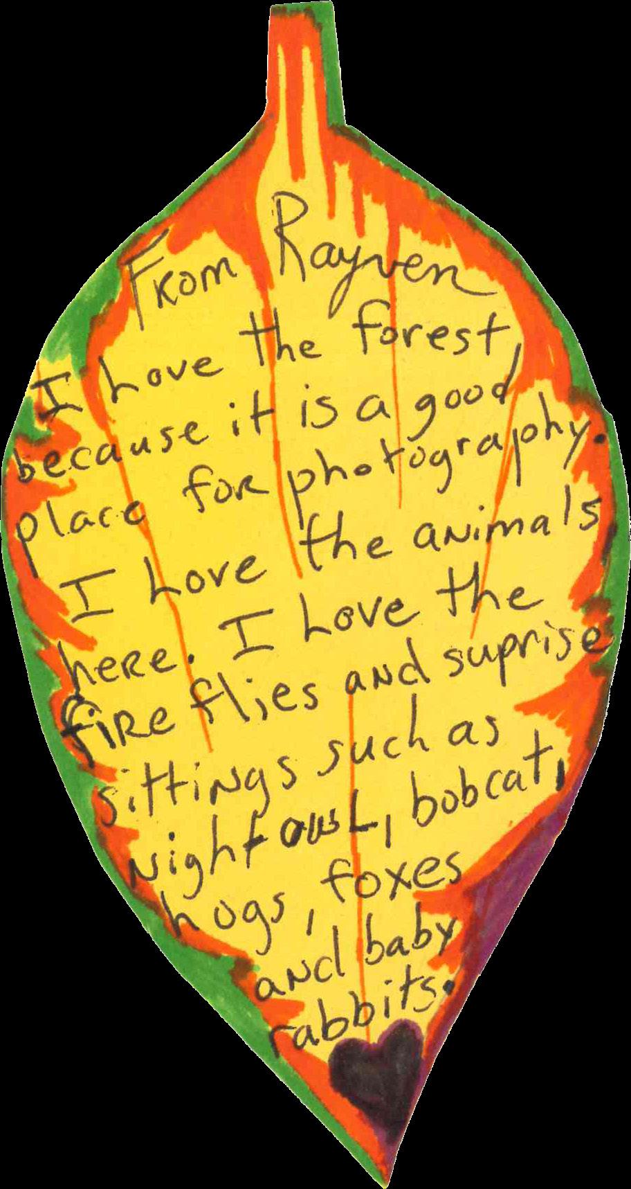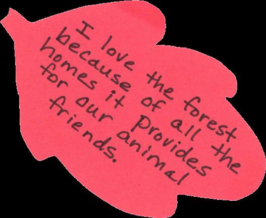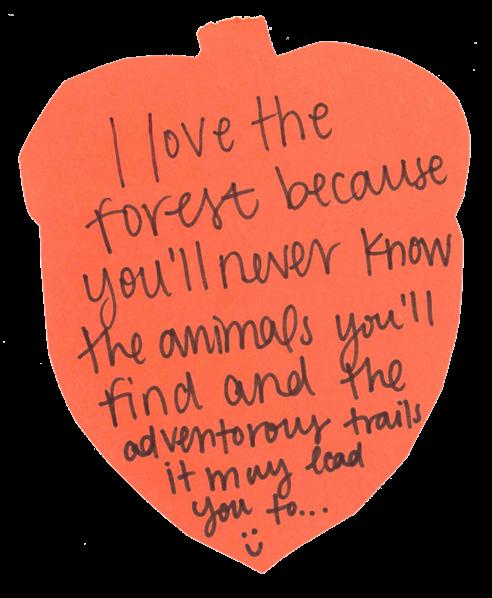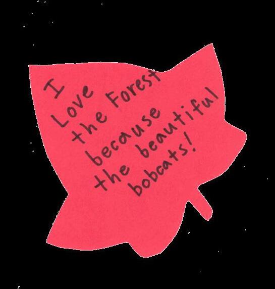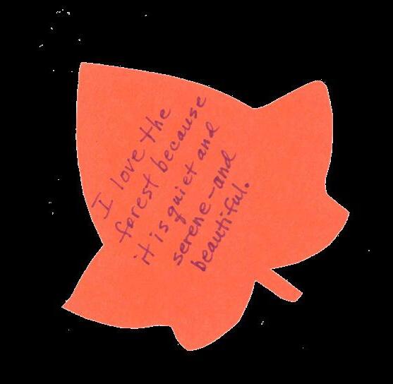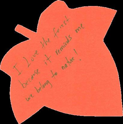 During the Forever Forest exhibit, our guests were invited to “leave-a-leaf” and share the reasons they love the forest. These leaves decorated the Nature Center’s atrium for the entire duration of the exhibit, creating a display that captivated visitors’ attention and sparked conversations between guests and Nature Center staff members. The leaves presented here are only a fraction of the submissions we received.