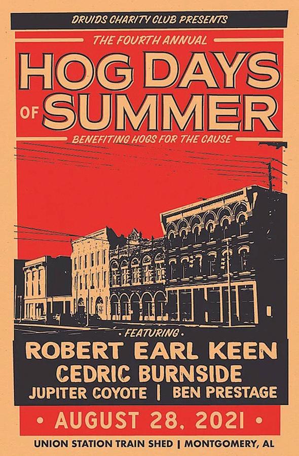 The Druids Charity Club is pleased to announce their 4th annual BBQ and Americana Music festival. ‘The Hog Days of Summer’ is a charity event benefitting Hogs for the Cause and the quest to support families struggling with the effects of pediatric brain cancer. Location: Union Station Train Shed, 300 Water Street, Montgomery, AL. Schedule: Doors at 3:00. BBQ will be available immediately; but when it's gone, it's gone! Music starts at 3:30. BBQ: Moe’s Original Bar B Que, Smokehouse Pit BBQ, Monroe Sausage, James Beard Award winning chef Ryan Prewitt (Peche; New Orleans), Druids BBQ, and more will be smoking delicious BBQ and side dishes, creating a variety of popular BBQ styles for our patrons. Music: An Americana themed music component consisting of (at least) three bands will be rocking the shed. The headliner will be the legendary Texas Americana-country songwriter extraordinaire Robert Earl Keen. Cedric Burnside, out of Holly Springs, MS will play a set of fresh Hill Country blues. Longtime local favorites Jupiter Coyote out of Macon, GA (and beyond) will be getting things started with a set of upbeat southern-jam-bluegrass-infused rock. Tentative Schedule: Doors: 3:00. BBQ: upon entry. Music: Jupiter Coyote: 3:30; Cedric Burnside: 5:30; Robert Earl Keen: 7:30. Tickets: GA Ticket: $30 ($40 day of show), Active Military, Police, Firefighter, EMS, & Student GA Ticket**: $25 ($35 day of show), VIP Area: very limited supply. Private Cash bar, private bathrooms, side of stage views: $100. Tickets available at www.eventbrite.com. For more info visit www.hogdays.org and