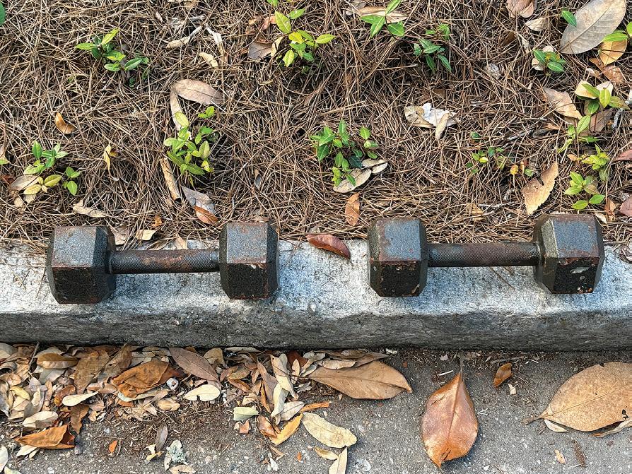 In fact, every 800 reps I’ll set the weights down on the curb and relax for a minute. Perhaps because my hair is gray, or because I am sweating volcanically, people in cars will stop, roll down the window and ask if I need help! I smile and reassure them I’m fine because their well-intentioned kindness touches me.
