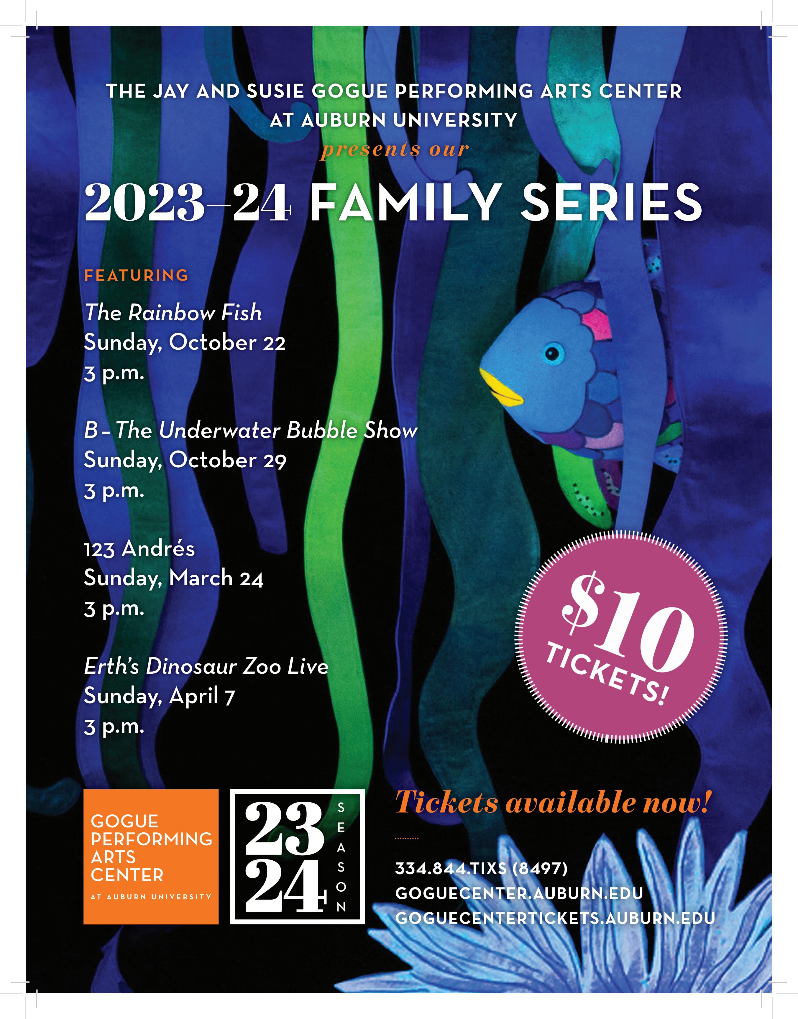 Presented annually by the Gogue Center, the Family Series offers children and parents and grandparents the opportunity to enjoy artistic, professional family programming in a state-of-the-art venue at an accessible price. This year, all Family Series performances will be presented indoors at the Woltosz Theatre as Sunday afternoon matinees. Seating is general admission and all tickets are priced at a family-friendly rate of $10. Tickets can be purchased online at goguecentertickets.auburn.edu or in-person at the Gogue Center box office, located at 910 South College Street in Auburn, Alabama, Tuesday through Friday, 10 a.m. to 4 p.m. For additional information on the 2023–24 Family Series and all other performances, patrons may contact the Gogue Center box office by telephone at 334.844.TIXS (8497) or via email at gpactickets@auburn.edu.
