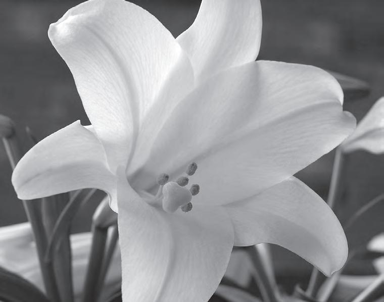 When purchasing an Easter lily, look for high quality plants that are aesthetically pleasing from all angles. Select medium-to-compact plants that are wellbalanced and proportional in size - not too tall and not too short. Choose plants with foliage that is dense and plentiful, all the way down to the soil line. As the flowers mature, remove the yellow anthers before the pollen starts to shed. This gives longer flower life and prevents the pollen from staining the white flowers. When a mature flower starts to wither after its prime, cut it off to make the plant more attractive while you still enjoy the fresher blooms.