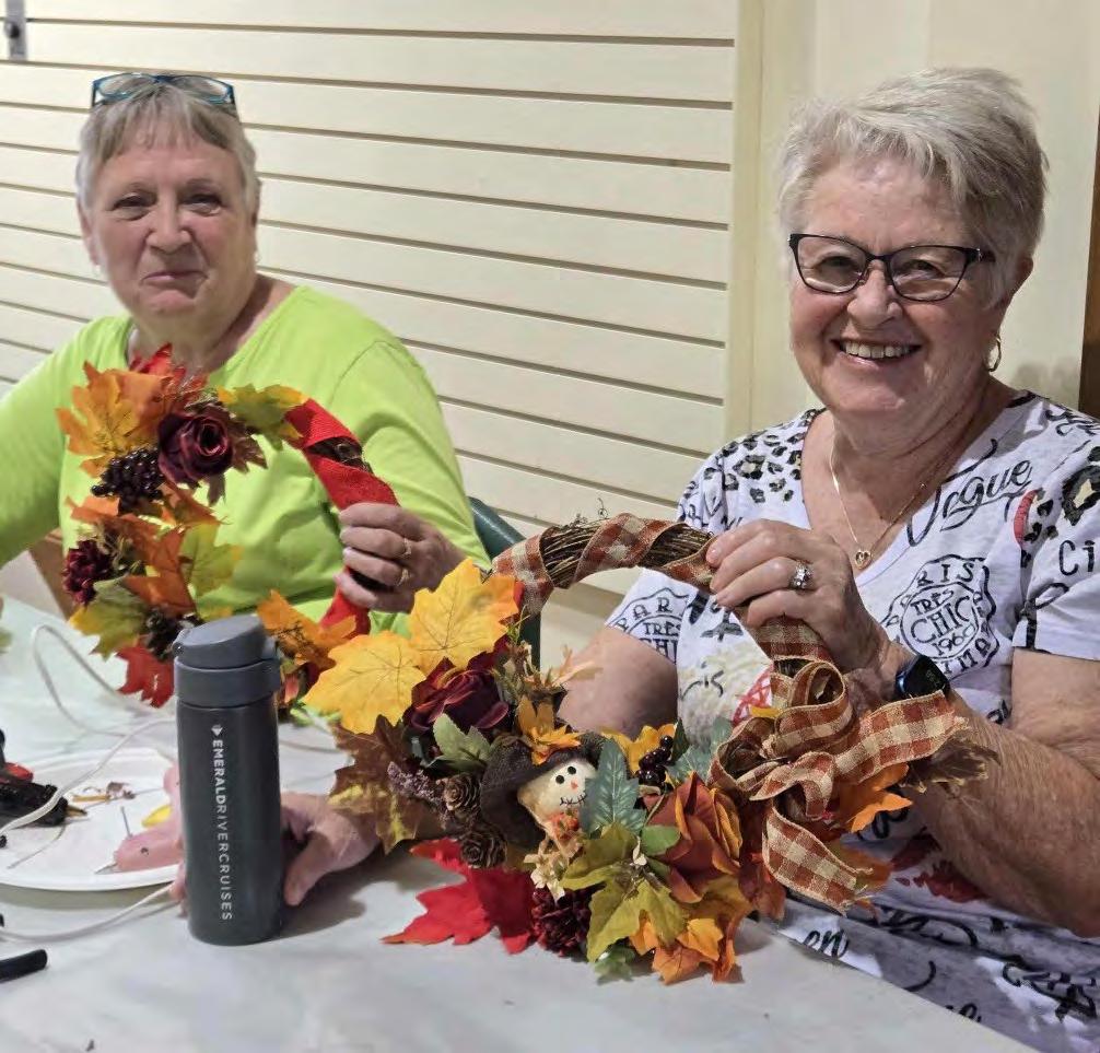 On September 30, 2025, Marianne Whyte and Celia Nolan instructed a group of nine seniors making a fall door hanging wreath. Each wreath was unique and beautiful. All the ladies were eager to return home and hang their creations. What a great way to spend a fall afternoon creating a beautiful memory. Well done ladies! Right Linda Mathison, Left Patti Mctavish