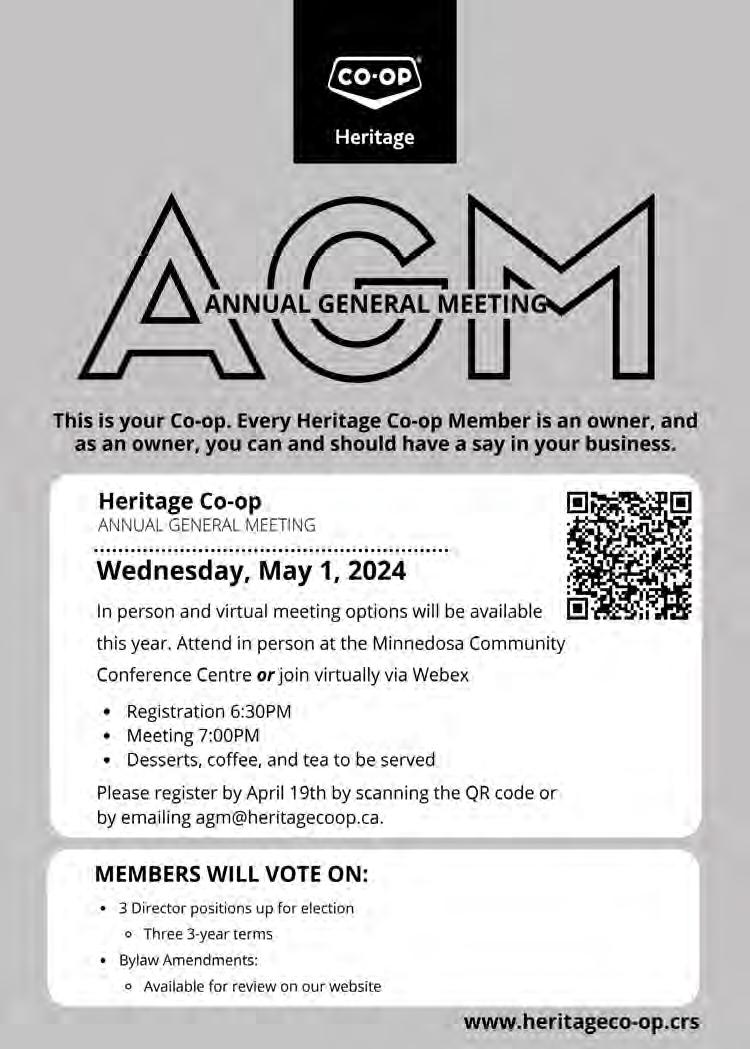 RURAL MUNICIPALITY OF OAKVIEW PUBLIC NOTICE REGARDING THE 2024 FINANCIAL PLAN PUBLIC NOTICE is hereby given in accordance with Subsection 162 (2) of The Municipal Act that the Council of the R. M. of Oakview intends to present its financial plan for the fiscal year 2024 at a public hearing in the Rapid City Council Chamber, 435 3rd Avenue, Rapid City on the 23rd day of April, 2024 at 7:30 p.m. Council will hear any person who wishes to make a representation, ask questions, or register an objection to the financial plan. Copies of the proposed financial plan will be available for review commencing on the 17th day of April, 2024 on our website at www.rmofoakview.ca or may be examined by any person during regular office hours of the Municipal offices at Oak River (10 Cochrane Street) or Rapid City (435 3rd Ave) or by emailing a request for a copy to financemgr@rmofoakview.ca Consultation with our community is an important component of the Municipality’s budget process. Council encourages you to attend. Donna Anderson Acting Chief Administrative Officer R. M. of Oakview March 26, 2024