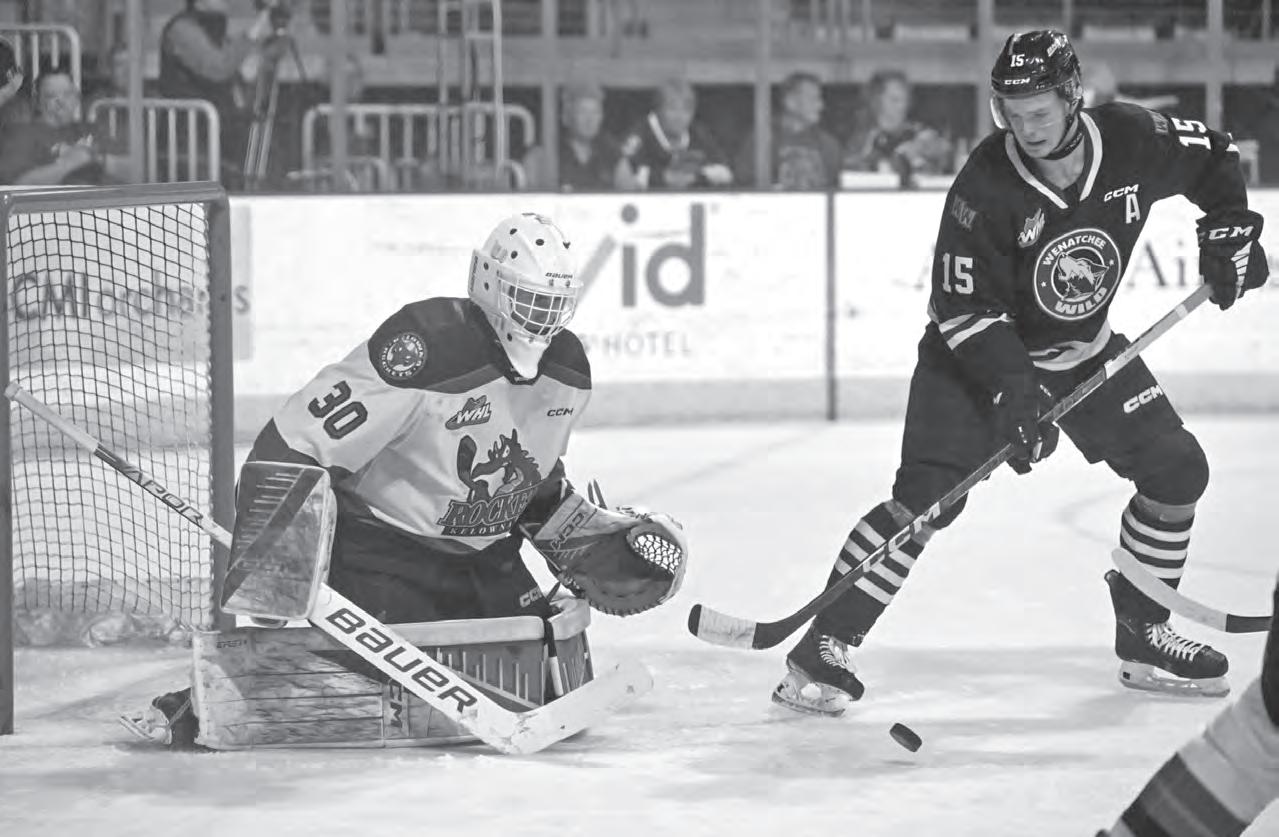 Kelowna power play at 6:18. Wood’s second goal came on a shot low in the left circle with 6:12 left in the period, trimming the deficit to 5-3, and Karter Prosofsky and Graham Sward posted goals 24 seconds apart on a fourminute slew-footing call against Carter Kowalyk, erasing what remained of the Kelowna lead.