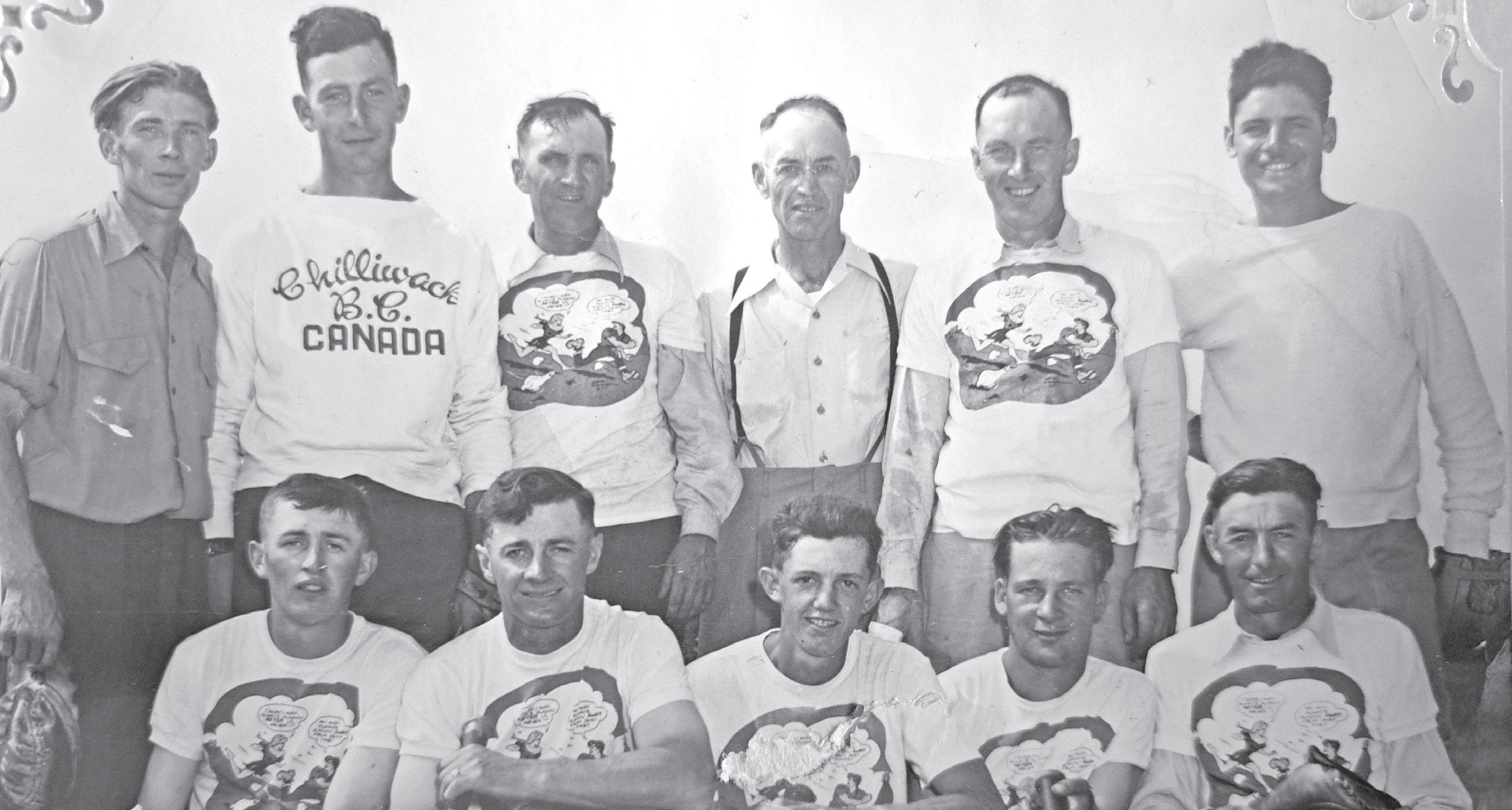 Back left to right: John Krahn, Dan Bates, Les Belinski, Charlie Nevil, Harry Bates, Don McFadden. Front left to right: Gordon Treloar, Jackie Treloar, Keith Robins, Bill MacDonald, Dave Leslie.