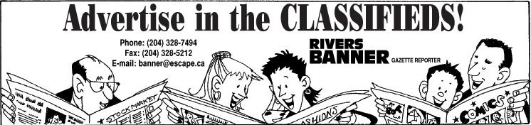 Rivers Banner Phone: (204) 328-7494 Email: info@riversbanner.com Website: www.riversbanner.com Advertise in the Classifieds! GAZETTE REPORTER Find something for the kid in you, in the RiveRs BanneR CLASSIFIEDS! BE ON TIME Advertising