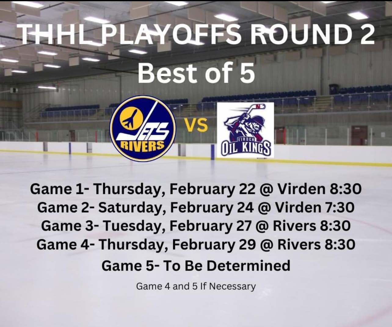Heading into round 2 of the THHL West Division Finals, Rivers Jets will be competing against Virden Oil Kings. It will be a best of five. Game one Thursday, February 22 in Virden, puck drops at 8:30pm. Game two Saturday, February 24 in Virden, puck drops at 7:30pm. Game three Tuesday, February 27 in Rivers, puck drops at 8:30pm. Game four Thursday, February 29 in Rivers, puck drops at 8:30pm. Game five will be determined if necessary.