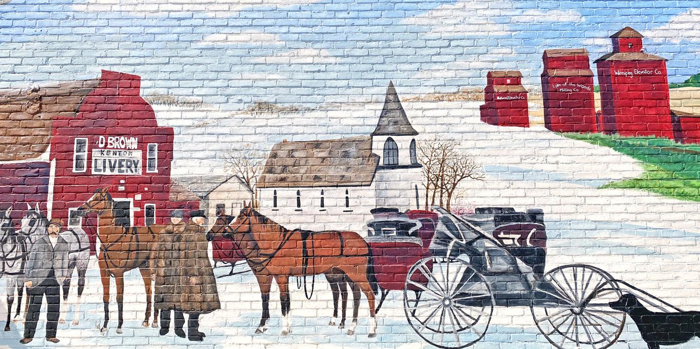 The mural on the side of Brierwood Creek Café and Grill was commissioned by the town of Kenton, it portrays a group of people standing in front of the livery stable that once was in Kenton. A livery was the place everyone brought their horses when they were in town, the image that was used was the night of a curling tournament. It also has the elevators and shows the changing of the seasons with the geese flying above. They added in a local gent, Danny Whyte, and Freddie Mercury for fun.