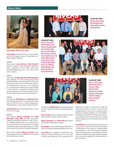 2002 Class Agents: Jeff Kotzen and Charlotte Lewis. Charlotte graduated from the School of the Museum of Fine Arts and is doing marketing for The Kensington, a real estate company in Boston. Jordan Benson married Brittney Payton on July 27, 2013 in Chicago.