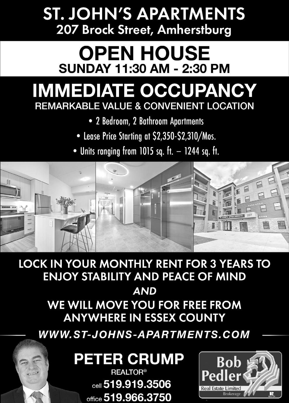 2 BEDROOM APARTMENT FOR RENT in Amherstburg, includes utilities $1,875. Very clean, well maintained, approximately 1100 sq. ft. Lower-duplex on Queen Street in quiet neighbourhood. One block from the Detroit River within a short walking distance to town. Carpet and ceramic tile throughout. Modern open-concept kitchen with island for a working or eating, with fridge and stove included. Private laundry-room with washer and dryer included. Windows in every room with mini blinds included, providing lots of natural daylight. Central forcedair conditioning and highefficiency gas furnace. No smoking. No dogs. Private access to your own patio within shared rear-yard. $1,875 monthly, includes: central forced-air heating and cooling, natural gas, electricity, water, and sewer. Minimum 1-year lease. Apply with income verification. First and last month’s rent required. By appointment only, call 519736-4473 between 9:00 a.m. to 5 p.m. and leave a detailed message.