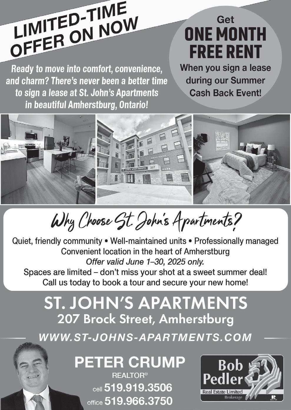 2 BEDROOM APARTMENT for Rent in Amherstburg, includes utilities $1,875. Very clean, well maintained, approximately 1100 sq. ft. Lower-duplex on Queen Street in quiet neighbourhood. One block from the Detroit River within a short walking distance to town. Carpet and ceramic tile throughout. Modern open-concept kitchen with island for a working or eating, with fridge, stove, and dishwasher included. Private laundry-room with washer and dryer included. Windows in every room with mini blinds included, providing lots of natural daylight. Central forcedair conditioning and highefficiency gas furnace. No smoking. No dogs. Private access to your own patio within shared rear-yard. $1,875 monthly, includes: central forced-air heating and cooling, natural gas, electricity, water, and sewer. Minimum 1-year lease. Apply with income verification. First and last month’s rent required. By appointment only, call 519736-4473 between 9:00 a.m. to 5 p.m. and leave a detailed message.