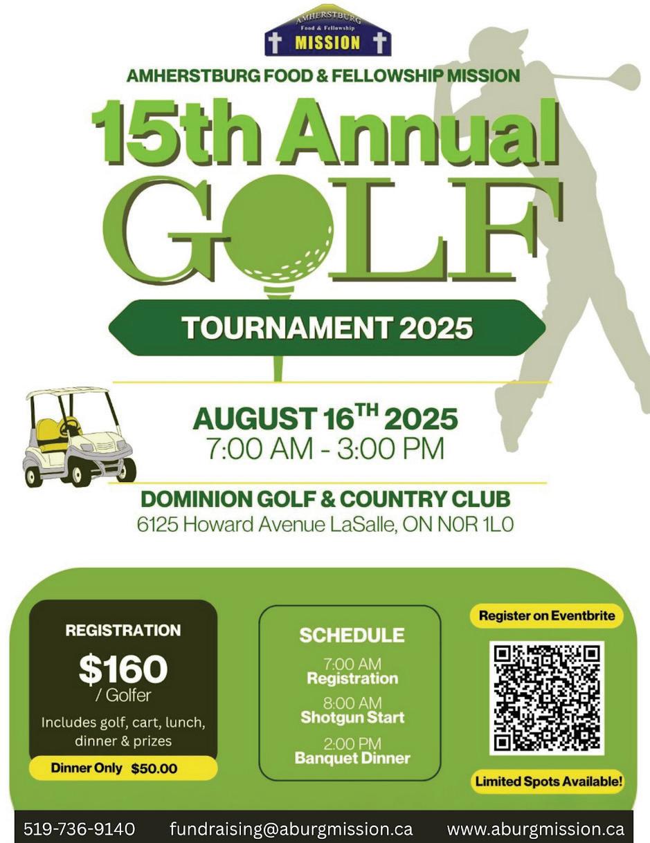 MISSION GOLF TOURNAMENT; The Amherstburg Food & Fellowship Mission hosts 15th annual golf tournament at Dominion Golf & Country Club (6125 Howard Ave., LaSalle) starting at 7 a.m. with registration and 8 a.m. shotgun start. Registration $160 per golfer, includes golf, cart, lunch, dinner and prizes. Dinner only (2 p.m.) $50. Register on Eventbrite. For info, call 519-736-9140, e-mail fundraising@aburgmission.ca or visit www.aburgmission. ca