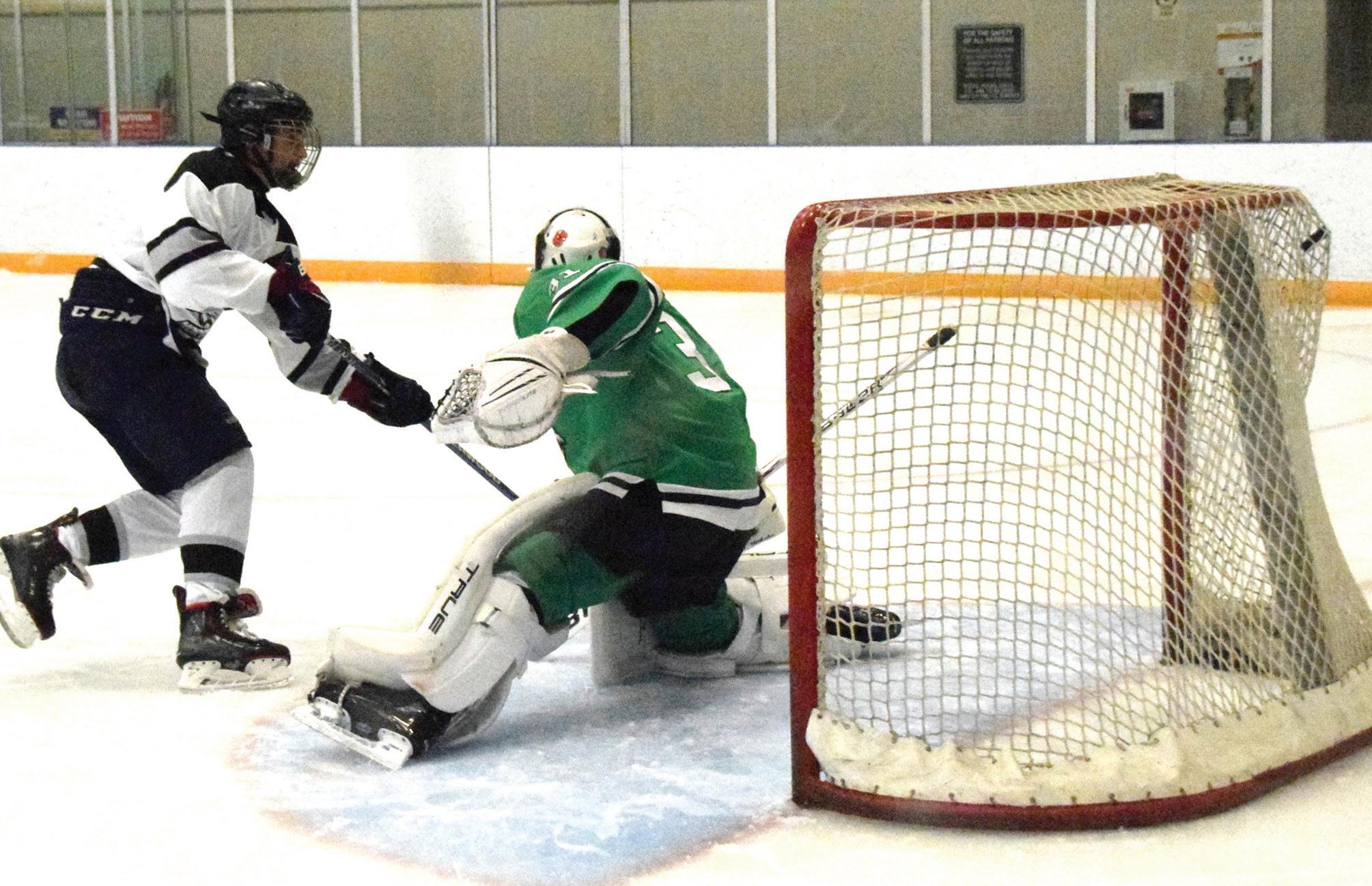 North Star’s Kyle Jones (left) scores a third period goal on Lajeunesse goalie Matteo Ristic last Thursday. North Star won the game 7-3 with Jones scoring twice. RTT Photo by Ron Giofu
