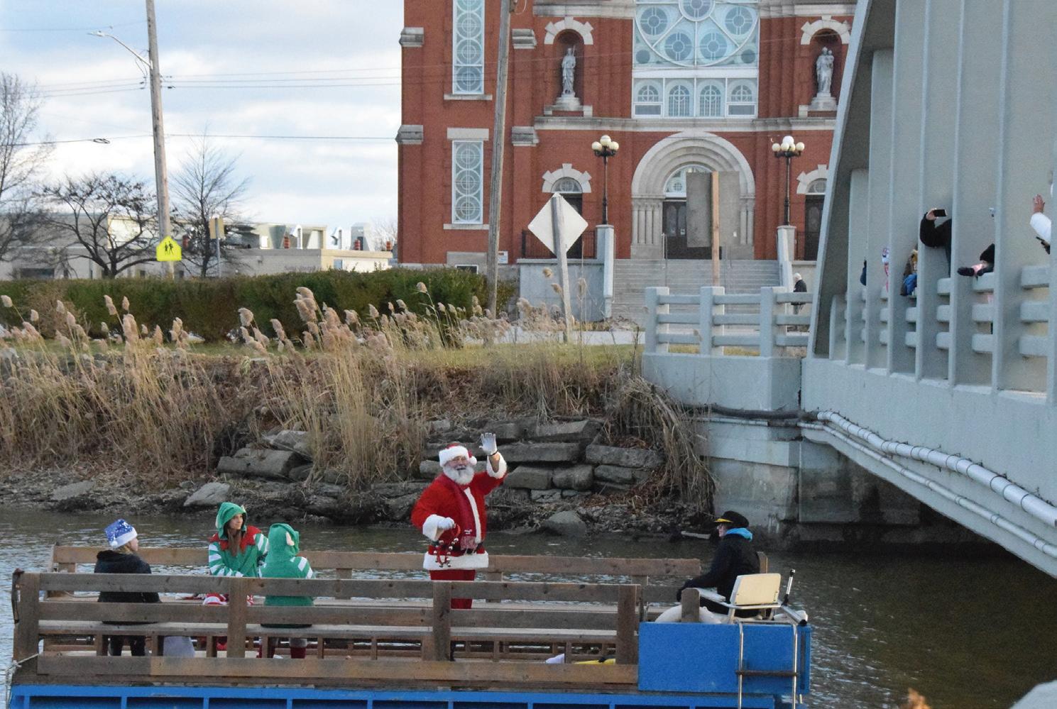 (Below) Santa Claus waves to the crowd from a boat after it emerged from under the River Canard bridge last Saturday. It docked at the River Canard Outpost.