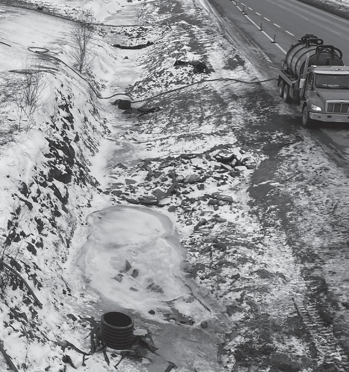 “Six tanker trucks are actively sucking up with hoses in the ditch, and another two are parked waiting their turn, another large tanker parked, several tandem dump trucks, a couple of pieces of heavy machinery digging in the parking area between the Murray’s building and the Tim Hortons,” he said. “(There are) more than a dozen people in hard hats visible, and this is about three weeks after the problem first became