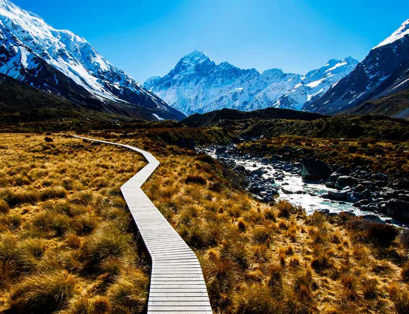 A day with some more spectacular sights. We’ll head north alongside the azure glacierfed Lake Pukaki to Mount Cook, at 12,316ft New Zealand’s highest mountain and surrounded by jagged snow-covered peaks. We’ll continue towards Lake Tekapo and visit