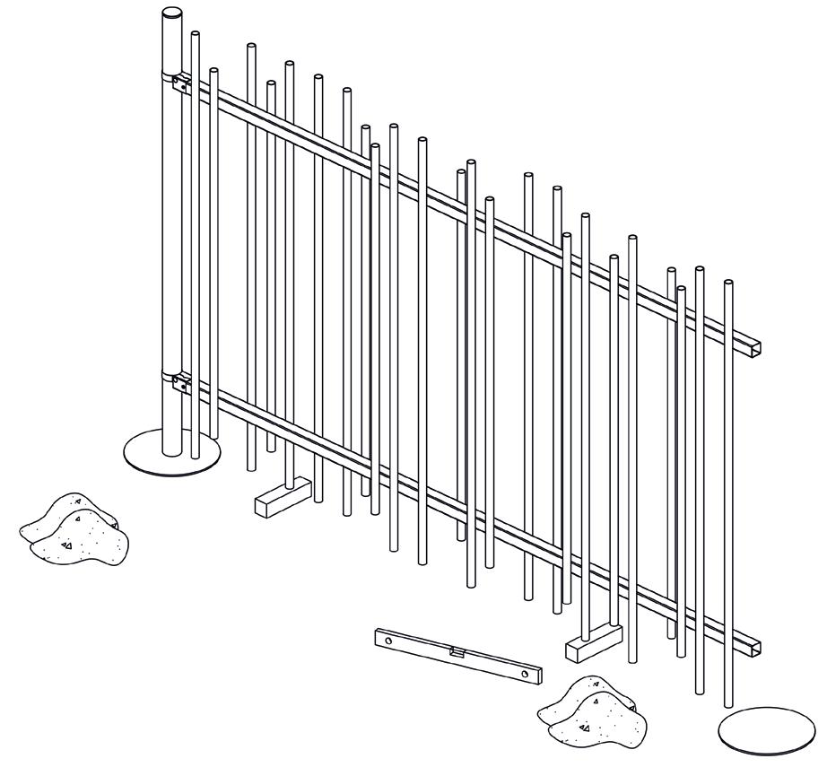 Tubo de acero galvanizado de diámetro 60mm y empalmes de aluminio para montar en obra sin ningún tipo de soldadura. La altura de la barandilla desde el suelo es de 1m10 (40cm de empotramiento en el terreno) y la distancia entre montantes verticales es de 2m70.