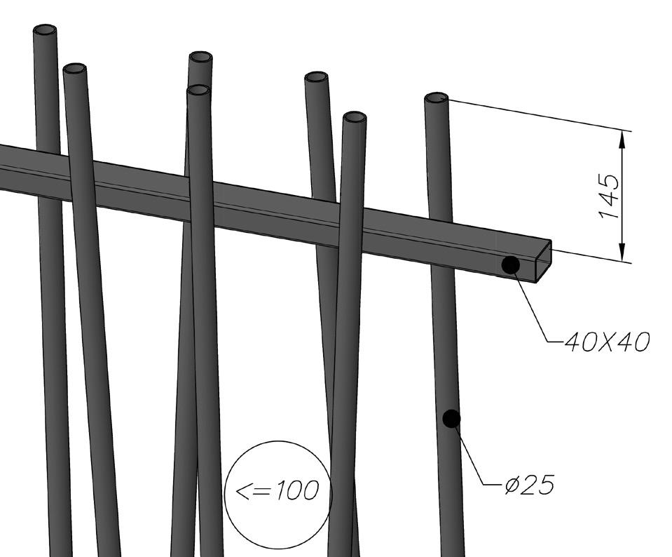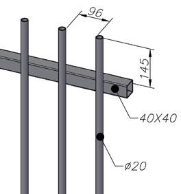 En las barandillas rellenas con panel Doble Hilo tipo 6/5/6 la altura de la barandilla desde el suelo es de 1m15 (40cm de empotramiento en el terreno) y la distancia entre montantes verticales es de 2m61. Los paneles Doble Hilo de relleno de la barandilla se fijan a los postes verticales con abrazaderas metálicas. 2m61