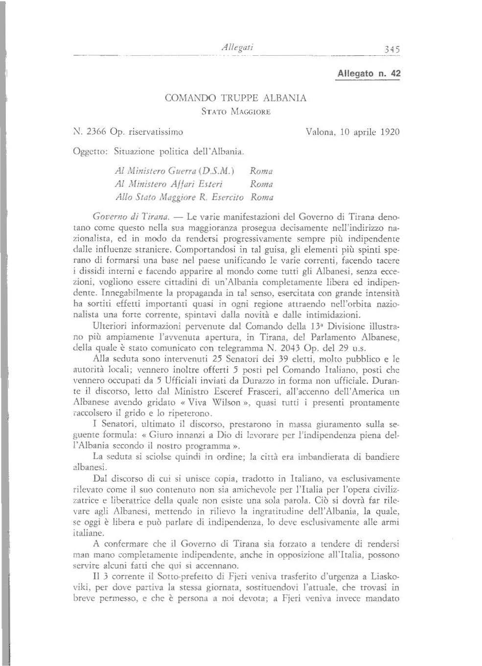 42 F 2366 RR. d:ua 10.4.1920 del C.T.A.: «Situazione politica deU 'Albania » . . . . . . . .