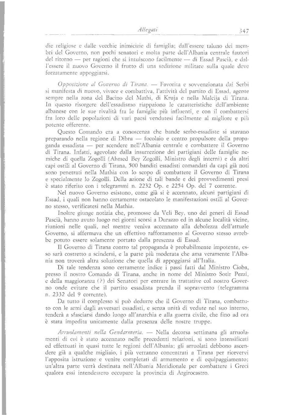 « Per non essere spinto verso combinazione serbo-greca egli scongiura Italia venire prendere ciò che le spetta e le conviene di prendere a tutela sua politica adriatica. Giova .. ? .. rammentare che possesso di Valona senza regioni che ne fortifichino le spalle sarebbe un peso ed un pericolo per l'Italia. Tal il pensiero di Essad che insiste nella sua affermazione secondo cui dopo presa di possesso di Durazzo si. potrà non solo ridurre a piccolissimo ? nostro presidio ma anche radunare da J 5 a 20 mila combattenti a nostra completa disposizione; egli stesso ne prenderebbe il comando . ( ...) » (1) .