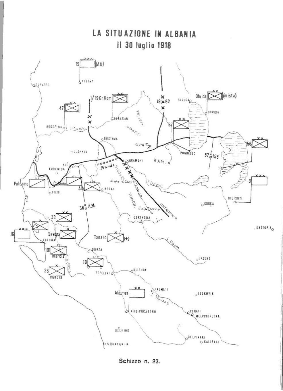 << Dei tre obbienivi su accennati, quello dell'altipiano di Ohrida è il principale, gli altri due possono valere a compl etare l'occupazione del paese e ad assicurare la base costiera ed i fianchi delle colonne operanti verso il centrale.