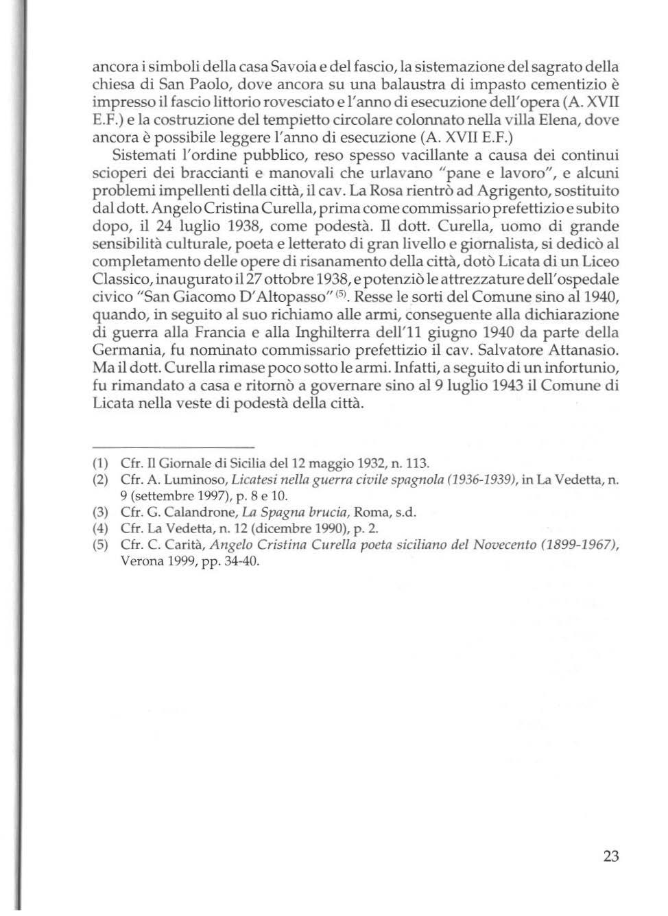 Sistemati l'ordine pubblico, reso spesso vacillante a causa dei continui scioperi dei braccianti e manovali che urlavano "pane e lavoro", e alcuni problemi impellenti della città, il cav. La Rosa rientrò ad Agrigento, sostituito dal dott. Angelo Cristina Curella, prima come commissario prefettizio e subito dopo, il 24 luglio 1938, come podestà. Il dott . Curella, uomo di grande sensibilità culturale, poeta e letterato di gran livello e giornalista, si dedicò al completamento delle opere di risanamento della città, dotò Licata di un Liceo Classico, inaugurato il 27 ottobre 1938, e potenziò le attrezzature dell'ospedale civico "San Giacomo D' Altopasso" <5J _ Resse le sorti del Comune sino al 1940, quando, in seguito al suo richiamo alle armi, conseguente alla dichiarazione di guerra alla Francia e alla Inghilterra dell'll giugno 1940 da parte della Germania, fu nominato commissario prefettizio il cav. Salvatore Attanasio . Ma il dott. Curella rimase poco sotto le armi. Infatti, a seguito di un infortunio, fu rimandato a casa e ritornò a governare sino al 9 luglio 1943 il Comune di Licata nella veste di podestà della città.