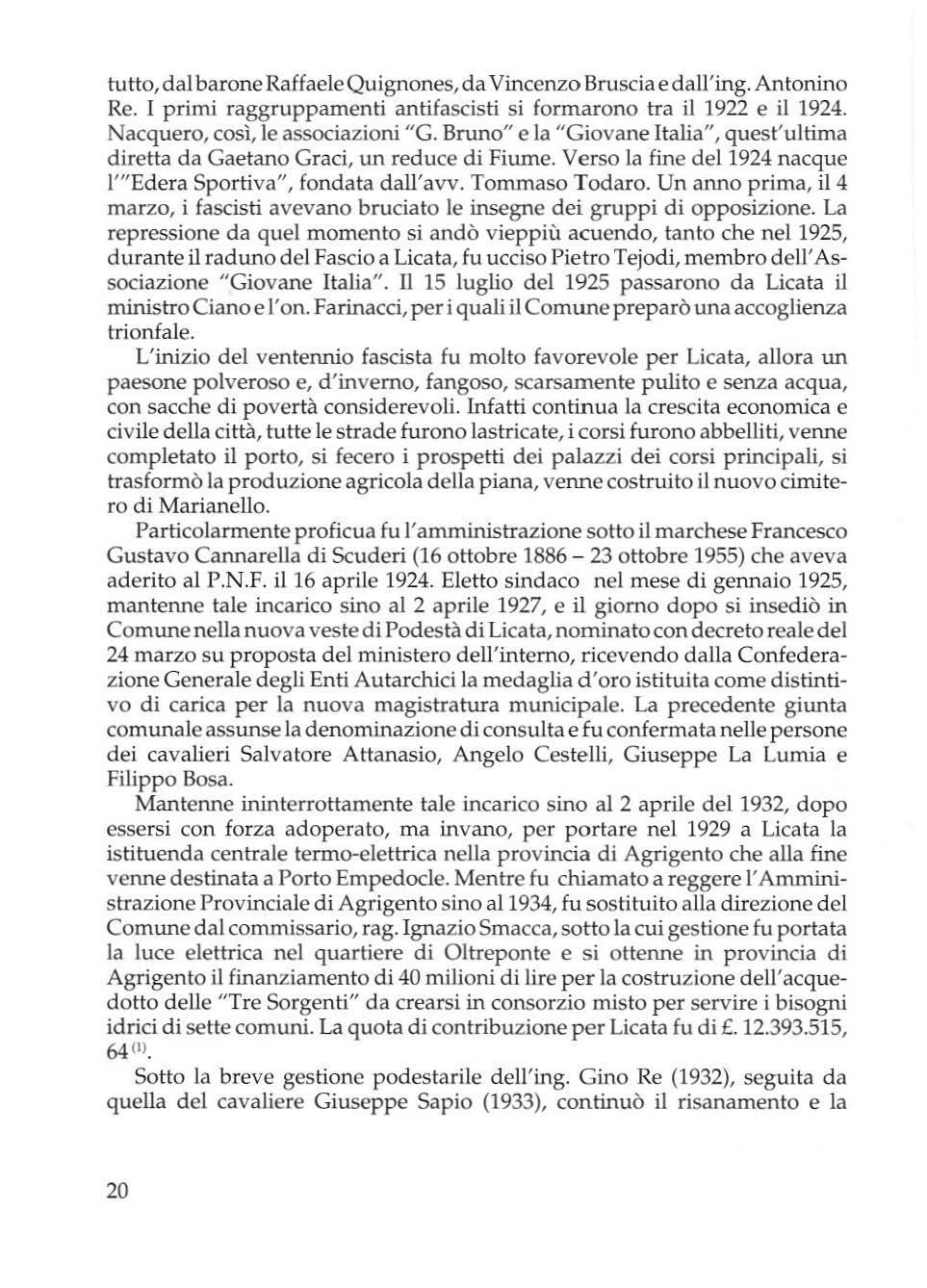 tutto,dalbaroneRaffaeleQuignones,daVincenzoBrusciaedall'ing.Antonino Re. I primi raggruppamenti antifascisti si formarono tra il 1922 e il 1924. Nacquero, così, l e associazioni "G. Bruno" e la "Giovane Itali a " , quest'ultima diretta da Gaetano Graci, un reduce di Fiume. Verso la fine del 1924 nacque !"'Edera Sportiva", fondata dall'avv. Tommaso Todaro. Un anno prima, il 4 marzo, i fascisti avevano bruciato le insegne dei gruppi di opposizione. La repressione da quel momento si andò vieppiù acuendo, tanto che nel 1925, durante il raduno del Fascio a Licata, fu ucciso Pietro Tejodi, membro dell' Associazione "Giovane Italia" . Il 15 luglio del 1925 passarono da Licata il ministro Ciano e l' on. Farinacci, per i quali il Comune preparò una accoglienza trionfale .