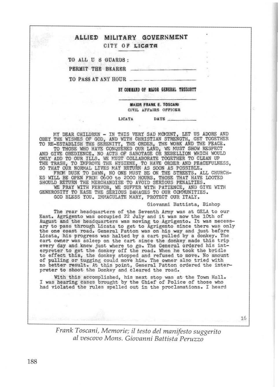 Ebbene, con questo saggio non intendiamo affrontare ancora, dato che lo hanno già fatto tantissimi altri, i massimi sistemi dello sbarco, né vogliamo ripercorrere nuovamente gli eventi della campagna militare in Sicilia, ma, utilizzando i documenti originali, da tempo non più secretati, del Piano Husky, i documenti dell'archivio storico del Comune di Licata che avevamo avuto modo di consultare tanti anni fa nel corso delle nostre ricerche per il libro "Alicata Dilecta", la corrispondenza con il figlio di Toscani, Gene, che ci ha fornito anche il memoriale del padre e numerose foto, e la corrispondenza con il giornalista -scrittore John Hersey che ci ha permesso di riedire il suo libro" A Bell for Adano", vogliamo unicamente descrivere soprattutto ciò che accadde a Licata prima e dopo lo sbarco e durante l'amministrazione civile degli americani dal 10 luglio 1943 ai primi del 1944 sotto la direzione del maggiore Frank Toscani e del capitano Wendell Phillips per restituire a questa città quella centralità nella storia che le è stata strappata.