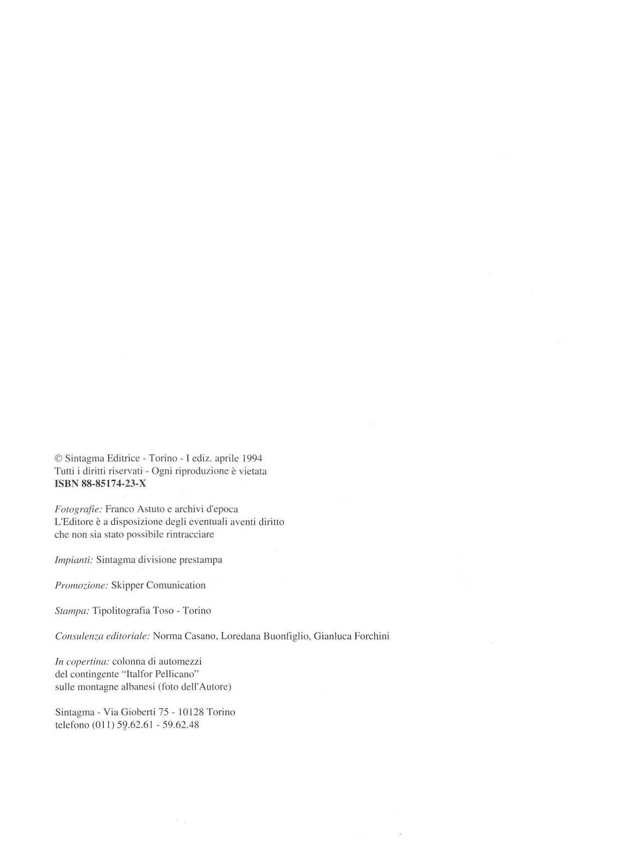 Questo lavoro , con tutti i suoi limiti , vuole e,ssere un atto di amicizia dovuto a tutti i colleghi e subordinati impiegati nell'Operazione Pellicano, cbe con il loro lavoro hanno tenuto alto il prestigio del nostro B~erci t o, vuol~ essere un documento il più completo possibile relativo fil.,., l'opera $'V olta dal Contingente Militare Italfor "Pellicano":an Albania.