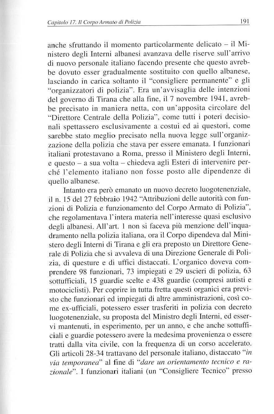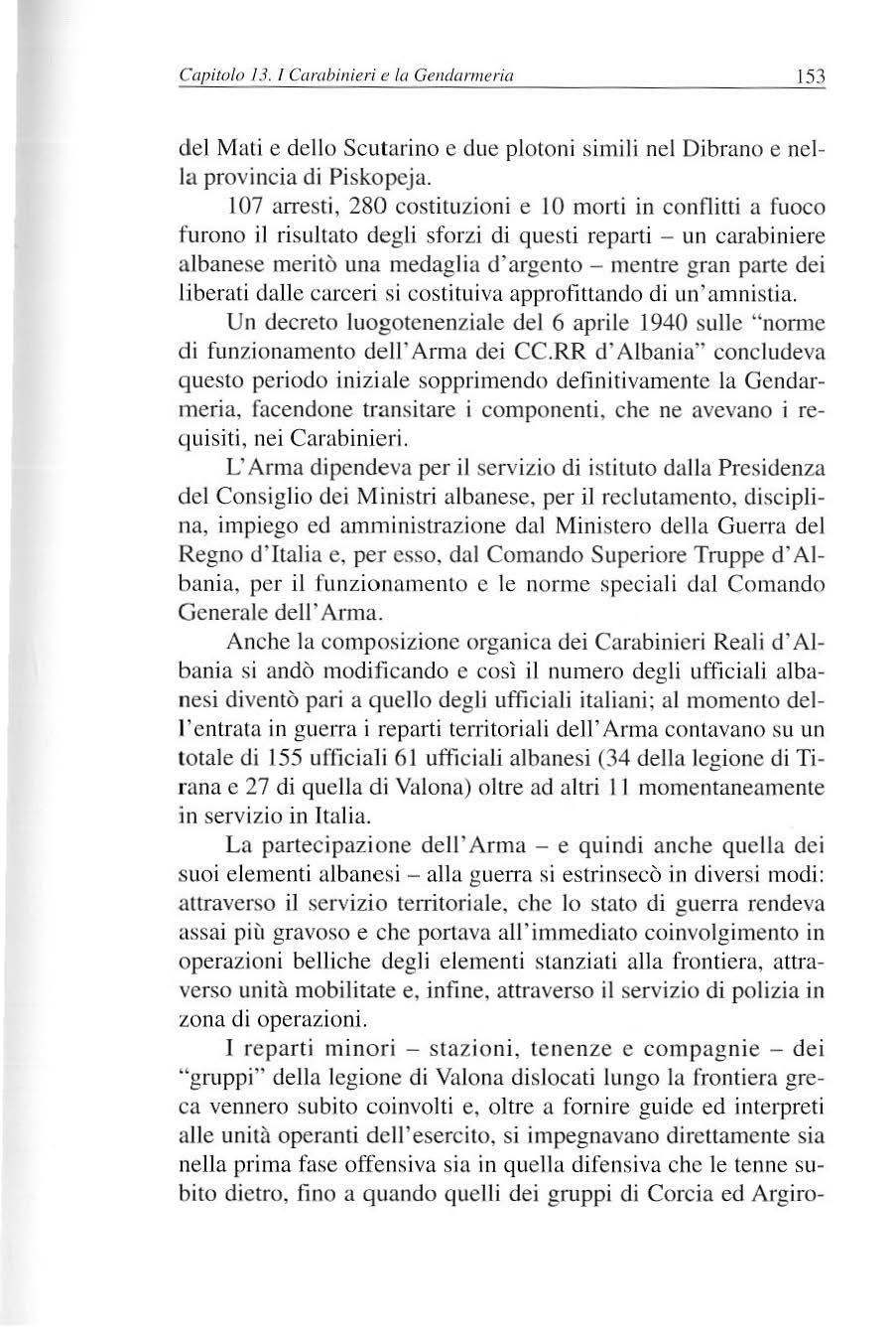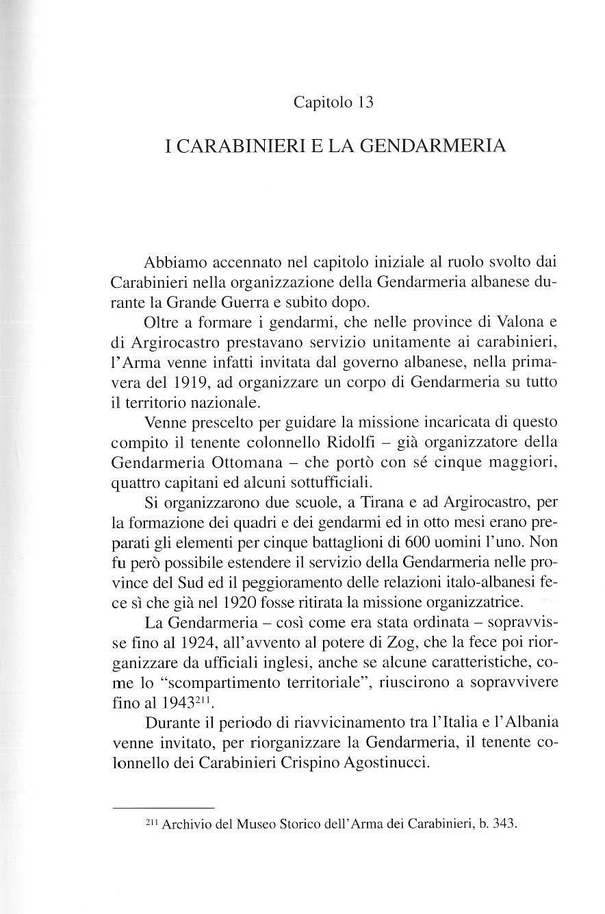 Negli stessi anni l'arma dei Carabinieri Reali - cui spettava il non fac ile compito cli tutelare la pubblica sicurezza nell'Albani a in guerra - aveva ordinato, addestrato ed impiegato elementi albanesi come agenti di po li zia e come gendarmi. 8 E.3-b. 125.